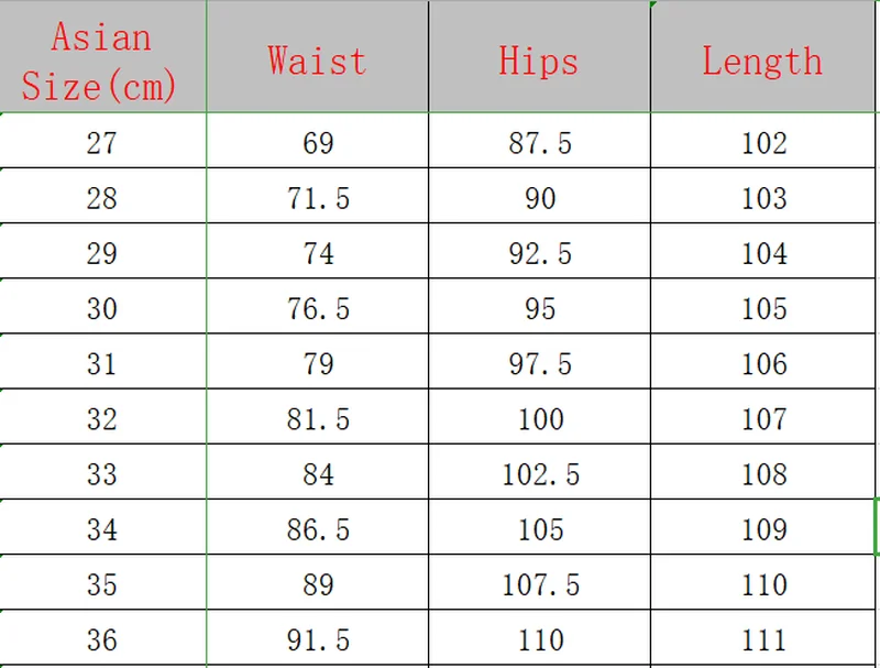 Таблица размеров