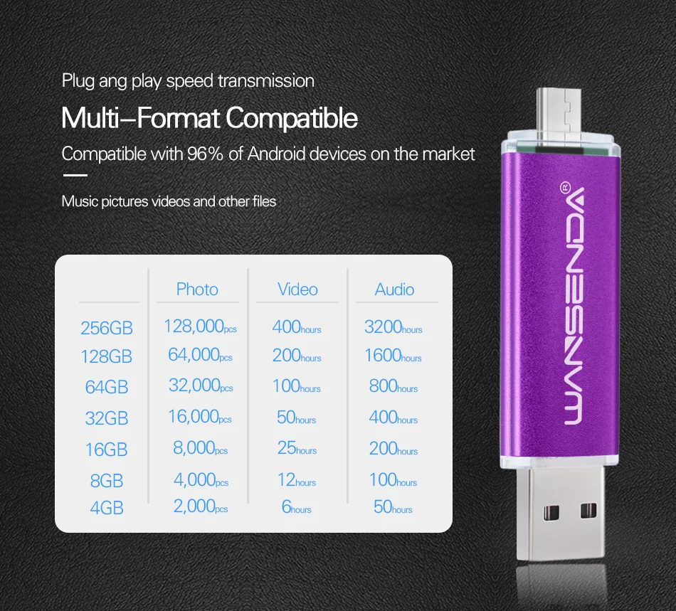 1. Высокая скорость и стабильная передача данных OTG usb флэш-накопитель.2. Подключи и работай, внешний источник питания не требуется.3,2-в-1 дизайн и поставляется в комплекте с кабелем Micro usb и USB 2,0 разъем, легко передача данных между смарт-телефонов и компьютеров.4. Используйте чип класса А, Стирайте повторно в течение 100,0000 раз.5. Твердотельный накопитель, портативный, ультра прозрачный колпачок может хорошо защитить разъем.6. Скорость записи: 5 МБ/с./с-10 МБ/с./с, скорость чтения: 10 МБ/с./с-20 МБ/с./с. Скорость работы зависит от различной операционной системы и различных вспышек, поэтому скорость может отличаться.7. Аппаратные требования: OTG-функциональный смартфон (Android системы 5,5 +), Тетрадь, MAC ПК с сенсорным экраном подключение через USB-порт.О реальной емкости