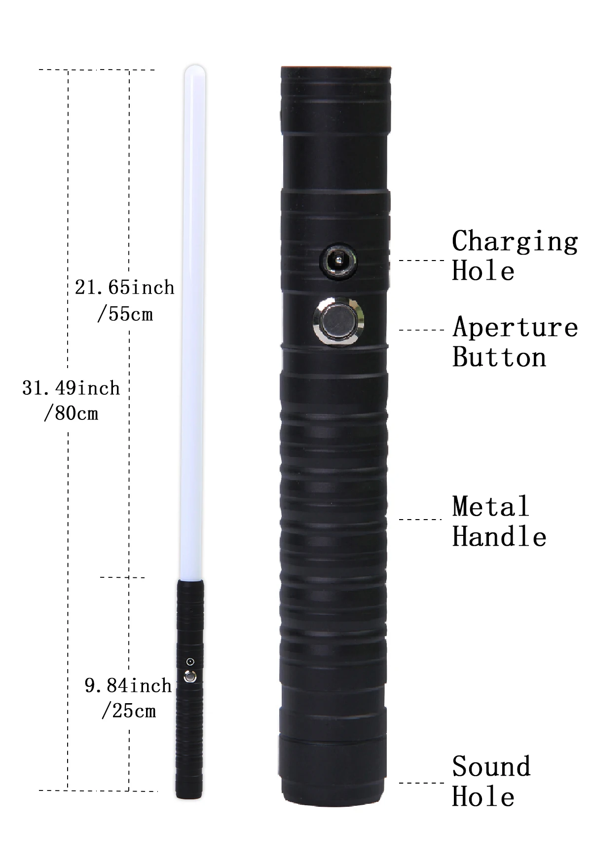 Материал: алюминиевый сплав, высококачественный ПК Общая длина: 31,49 дюйма/80 см Длина ручки: 9,84 дюйма/25 см Длина лезвия: 21,65 дюйма/59 см Диаметр: 1 дюйм/3 см Звук: 1 вид звуков Цвет лезвия: 7 цветов (красный, желтый, зеленый, голубой, синий, розовый, белый) Цвет ручки: черный Время зарядки: 2-3 часа Напряжение зарядки: 5 В/1 А (макс.) Батарея: 18650 3,7 V Емкость аккумулятора: 1200 мАч Изюминка: 3*1 Вт Зарядное устройство: 5V1A Разъем: Да