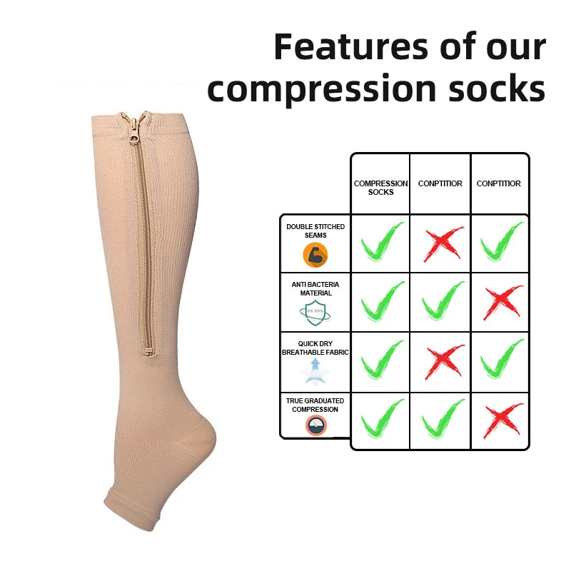 Гуманизированный дизайн деталей: стили с открытым носком разработаны с ВМЕСТИТЕЛЬНЫМ размером носка для пациентов, которым требуется дополнительная «wiggle room». Гладкая и прочная застежка-молния плотно прилегает и не открывается. Застежка-молния легко надевается и снимается. Гибкие, но плотно прилегающие к более широким манжетам носки остаются на месте в течение дня. Более толстый и гладкий трикотажный топ предназначен для комфортного ношения.