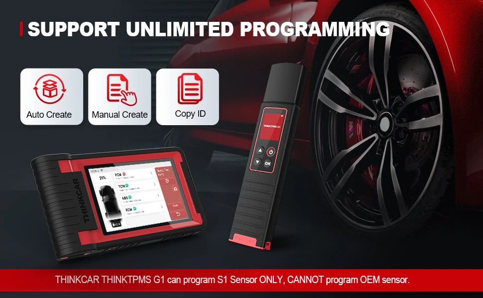 Thinktpms G1 поддерживает неограниченную функцию повторного программирования, охватывая более 98% импортных моделей с системой давления в шинах и поддерживает несколько способов формирования идентификаторов: руководство, копия и автоматическое создание