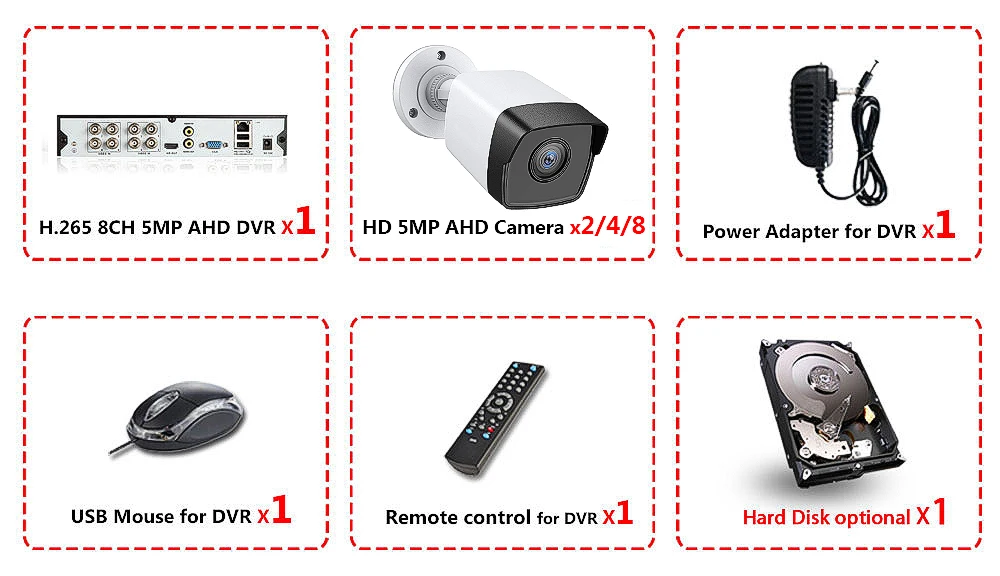 1 х 8-канальный H.265 AHD 5MP DVR NVR HVR 6 в 1 цифровой видеорегистратор;2/4/8 x HD 5.0MP Крытый Открытый ИК День ночного видения атмосферостойкие камеры;1 х адаптер питания для DVR;1 X USB мышь для DVR;1 компакт-диск программного обеспечения для DVR;1 пульт дистанционного управления для DVR;Жесткий диск опционально!Видео кабель в комплект не входит!