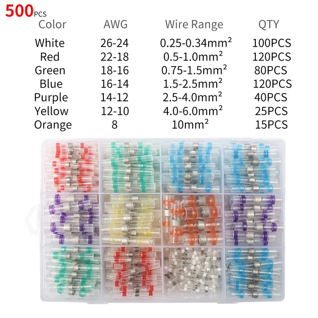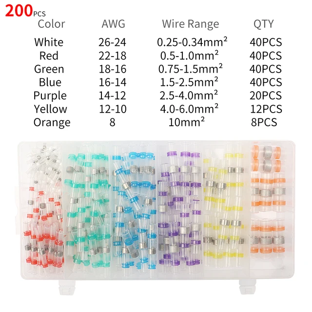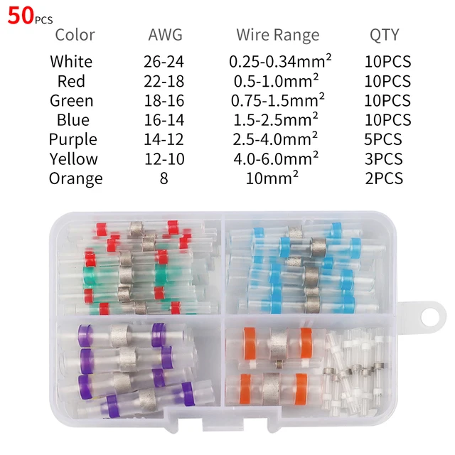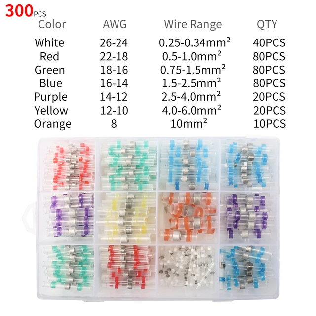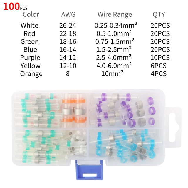 ✔Организация: Наши разъемы поставляются в ящике для хранения, их легко хранить и переносить. Цветная трубка позволяет легко определить правильный размер соединителя для каждого приложения. Ассортимент соединителей включает белый (AWG 26 - 24), красный (AWG 22 - 18), синий (AWG 16 - 14) и желтый (AWG 12 - 10) соединители для паяльного уплотнения, которые могут использоваться на проводе AWG от 26 до 10.