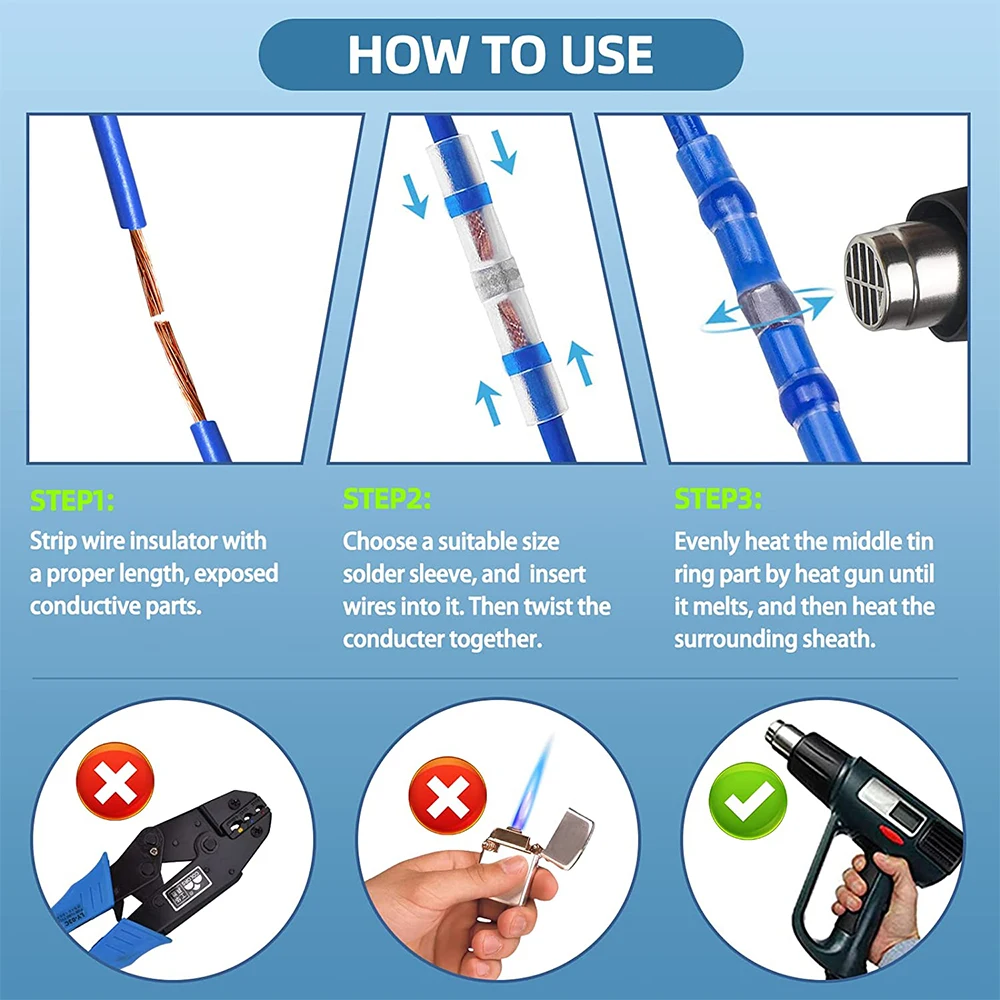 ✔Водонепроницаемость и изоляция: конструкция с двумя стенками-наружные полиолефиновые трубки обеспечивают изоляцию и повышают прочность на изгиб; Термоплавкий клей и припой внутри обеспечивают плотное соединение проводов и позволяют избежать выскальзывания проводов из терминала