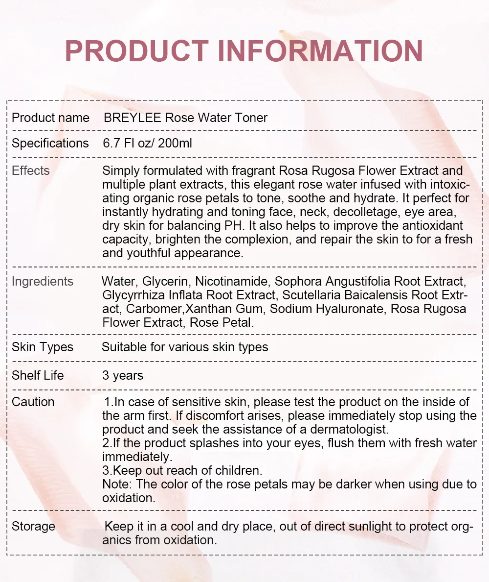 Лепесток розы BREYLEE глубоко увлажняет кожу, корректор тонера для лица и тела с усовершенствованным тонером 200 мл