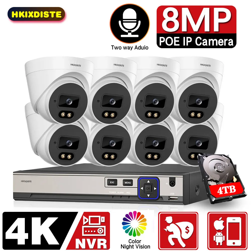 Купольная камера видеонаблюдения, 4-канальная система безопасности, с функцией ночного видения, NVR, 8 Мп, IP, POE, двустороннее аудио, 4 к