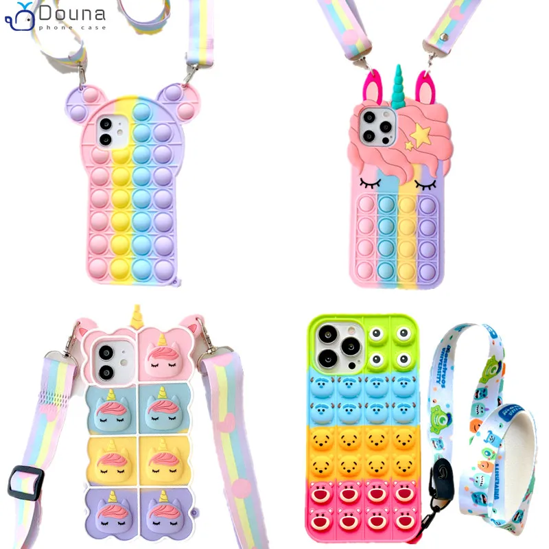 Чехол для IPhone 13 12 Mini 11 Pro Max с пузырьковым ремешком, снятие стресса, фиджет, милая игрушка, Радужный монстр, единорог, мягкий чехол