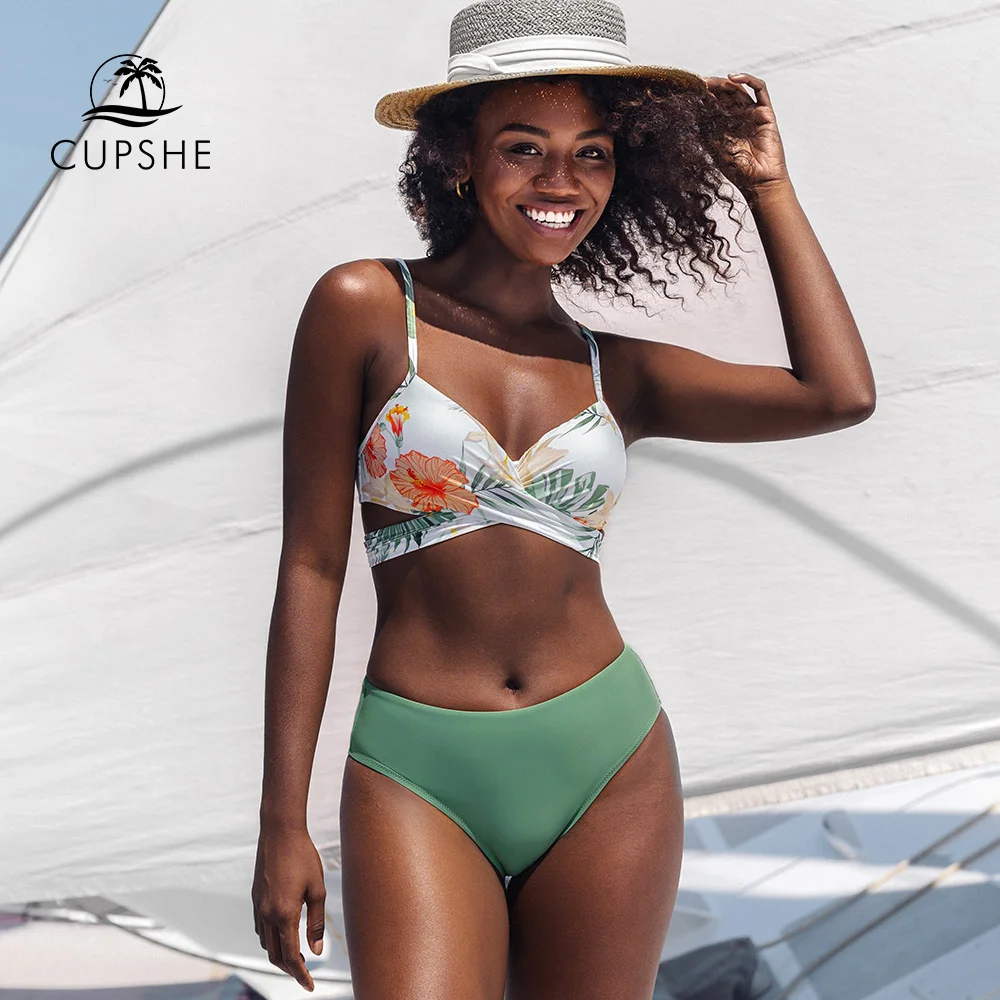 CUPSHE жаккардовый зеленый цветочный купальник бикини с высокой тал...