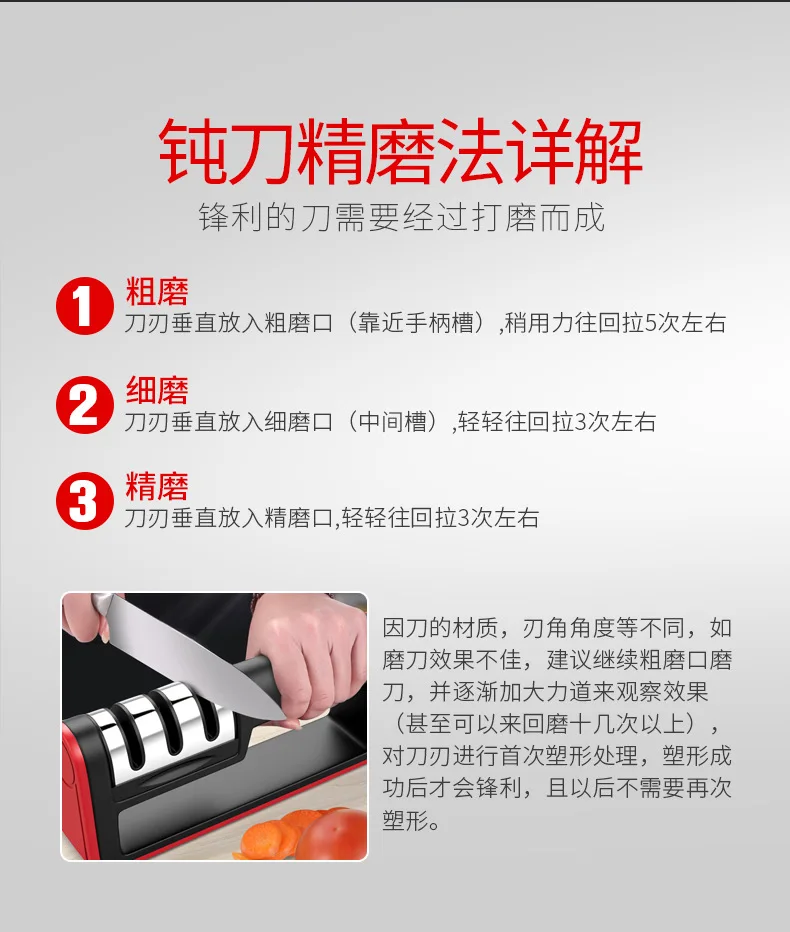 Особенности: 1. Стильный и безопасный дизайн, легко чистить и хранить. 2. Нескользящие резиновые ножки обеспечивают вашу устойчивость при заточке 3,3 стадии заточки (тонкая, керамическая и грубая), обеспечивают идеальный результат заточки Инструкции: 1. Нож немного тупый, можно использовать керамическое отверстие, оттягивать назад около 5 раз, не забудьте не тянуть назад и вперед. 2. При резке мяса, если он не резкий, сначала используйте алмазное отверстие, чтобы оттянуть 5 раз, а затем используйте керамическое отверстие, чтобы оттянуть 5 раз 3. Нож очень тупой, можно использовать отверстие из вольфрамовой стали, оттягивать 5 раз