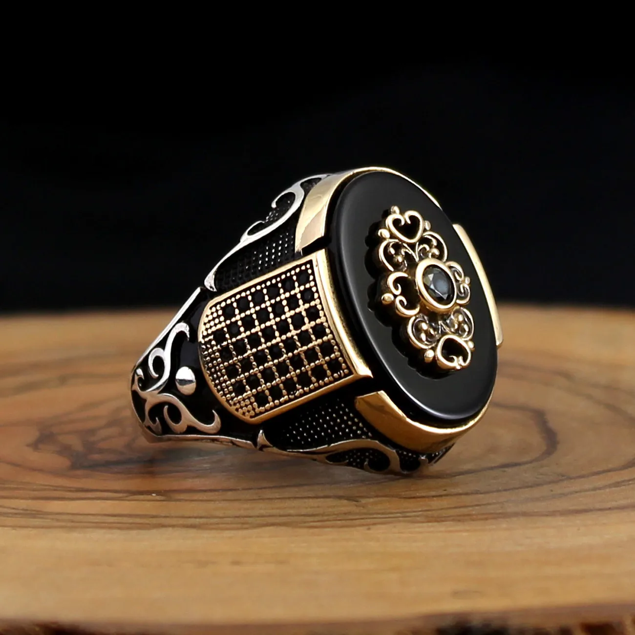 Мужское винтажное серебряное кольцо с натуральным ониксом, цирконием, ювелирное изделие, свадебный браслет, подарок на день отца, подарок на Рождество, мужские роскошные ювелирные изделия