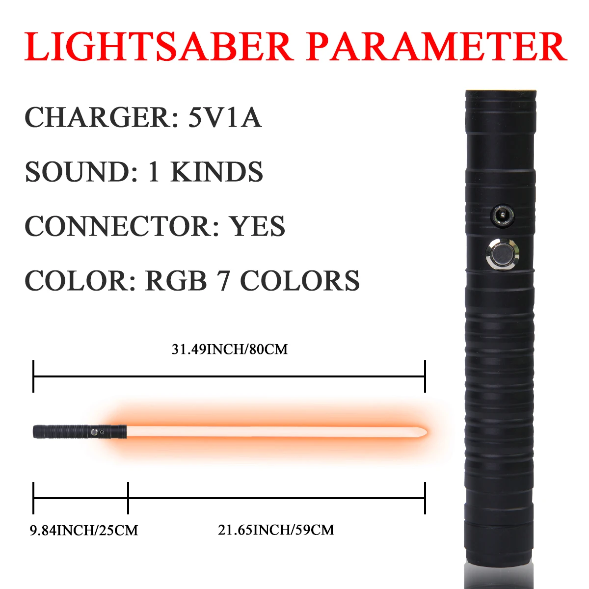 Материал: алюминиевый сплав, высококачественный ПК Общая длина: 31,49 дюйма/80 см Длина ручки: 9,84 дюйма/25 см Длина лезвия: 21,65 дюйма/59 см Диаметр: 1 дюйм/3 см Звук: 1 вид звуков Цвет лезвия: 7 цветов (красный, желтый, зеленый, голубой, синий, розовый, белый) Цвет ручки: черный Время зарядки: 2-3 часа Напряжение зарядки: 5 В/1 А (макс.) Батарея: 18650 3,7 V Емкость аккумулятора: 1200 мАч Изюминка: 3*1 Вт Зарядное устройство: 5V1A Разъем: Да