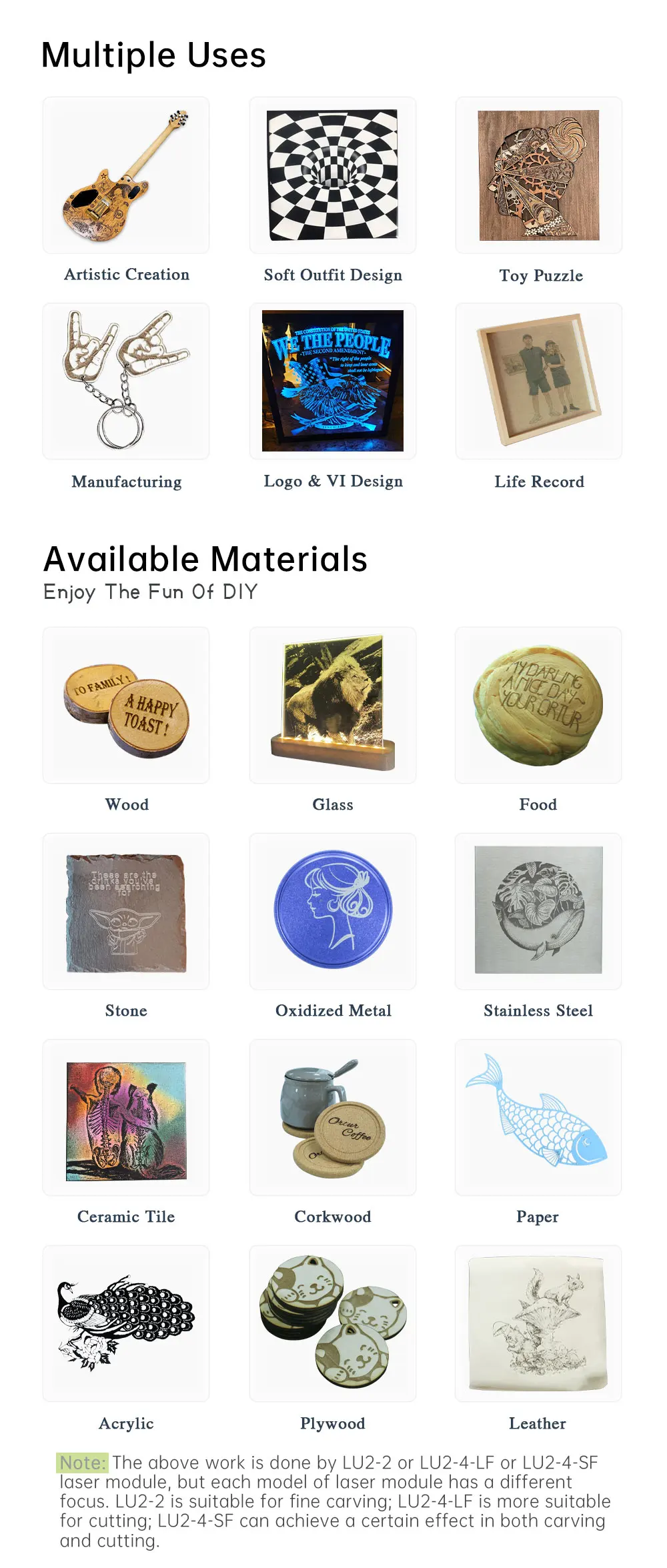 Король наиболее экономически эффективный диодный лазер гравировальный станок:Модернизировано от самая популярная ortur лазерный master 2, Ortur лазерный мастер 2 S2 приняты новейшие OLM-PRO-V10 материнская плата и 32-битный MCU + 24V цепь, фокусного пятна 0,08 мм * 0,15 мм представляет собой четверти Размер Средний lasers' костры, 9 мм толстых досок не предел.Наиболее профессиональные варианты гравировки и резки:И SF, и LF могут сделать гравировку и резку!Фокус SF лазера меньше, изображение тоньше, и он больше подходит для гравировки.LF имеет большую глубину поля с большей плотностью мощности. И больше подходит для резки.Максимальная толщина составляет 20 мм фанеры (оснащена LF соплом, режущая поверхность гладкая и не будет черных краев).Покупатели только заказывают воздушный компрессор самостоятельно для LU2-4 LF лазерной формы.
