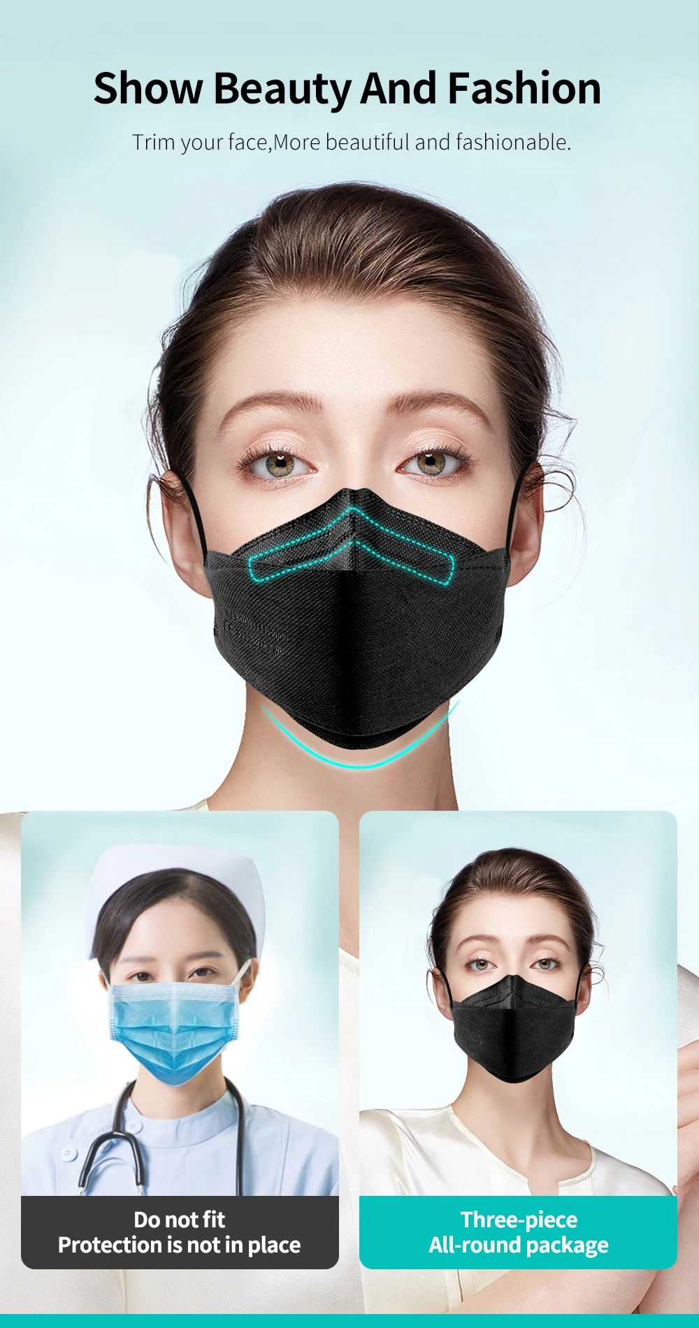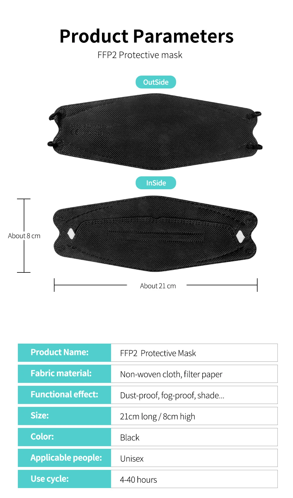 ①Comfortable в носке.②Хороший эффект фильтрации, особенно для очень мелких частиц и пыли.③ Подходит для различных форм лица.④ Высококачественный защитный эффект. Его защитный эффект такой же, как маска KN95 и Европейская маска FFP2.Applicable применяется в различных средах, где защитные маски необходимо носить в течение длительного времени, таких как фабрики, школы, компании, торговые центры, песчаные бури, строительные площадки, больницы, парки и т. Д.
