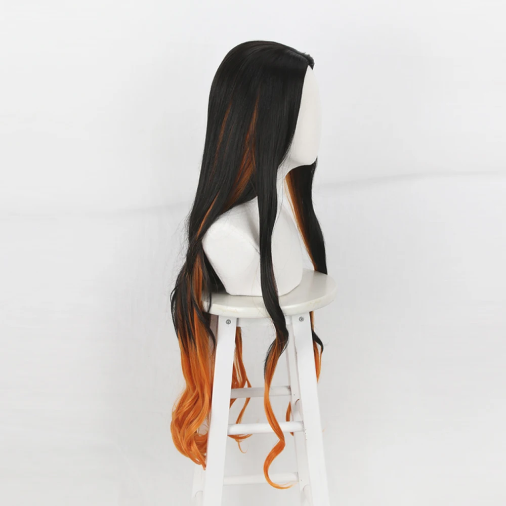 Парик для косплея киметасу из мф рассекающий демонов, термостойкий синтетический, 95 см, с волнистыми черными и оранжевыми волосами, с бесплатной шапочкой