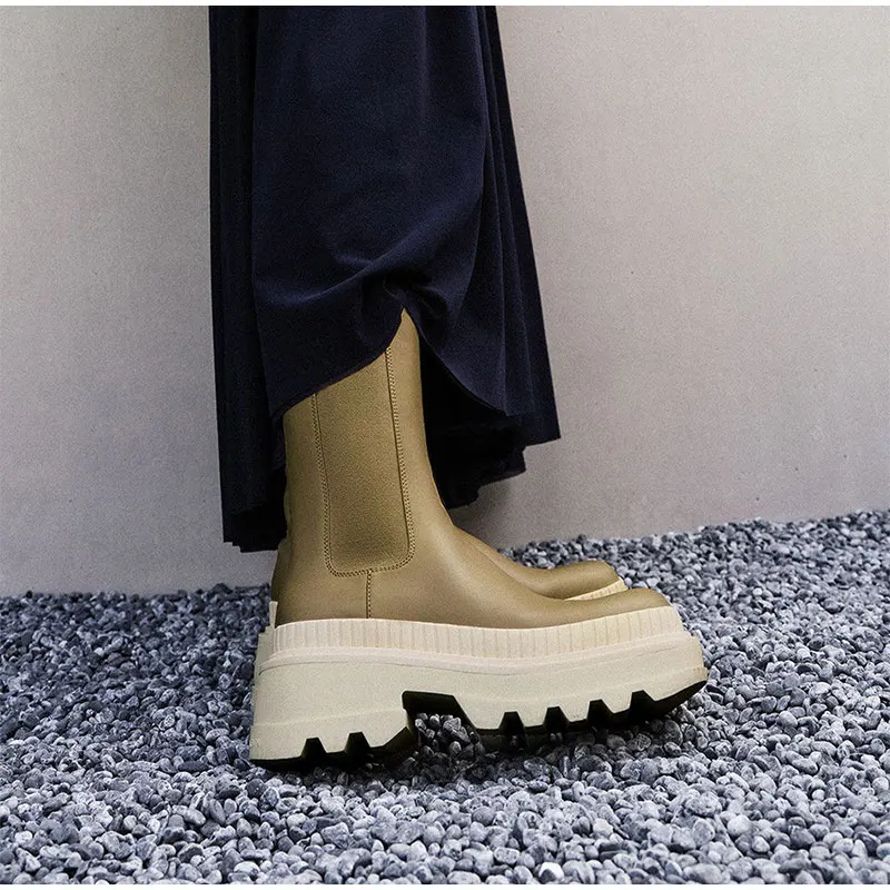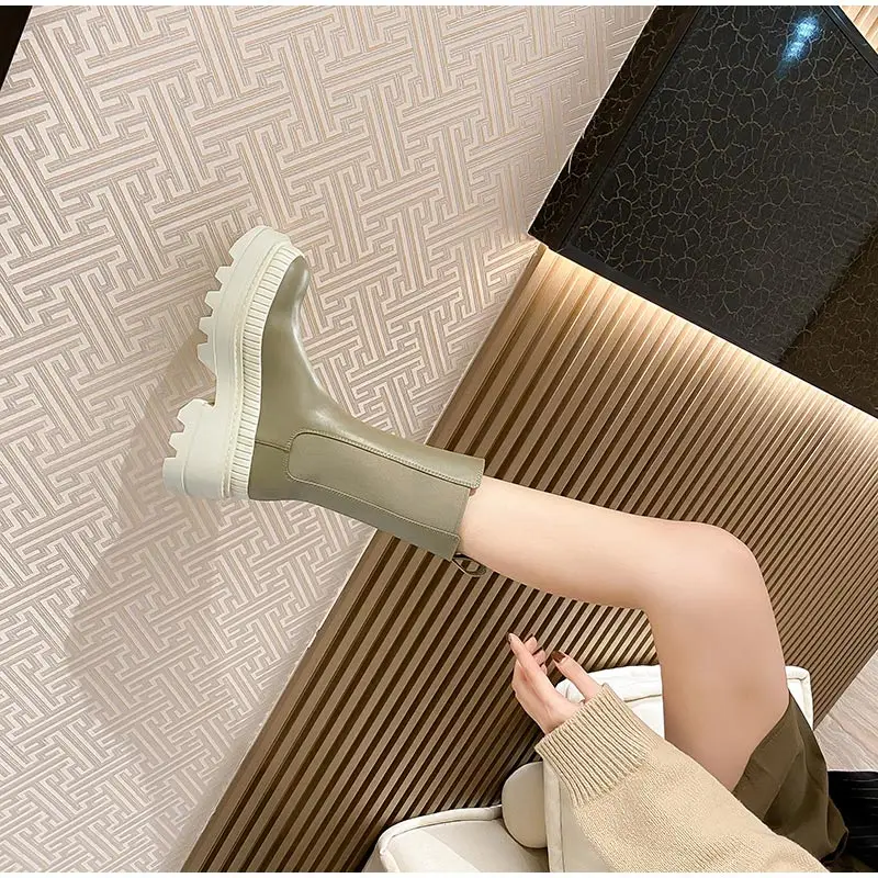 Женские эластичные сапоги до середины икры, однотонные женские кожаные ботинки челси без шнуровки, модная Нескользящая женская обувь на толстой платформе, 2022