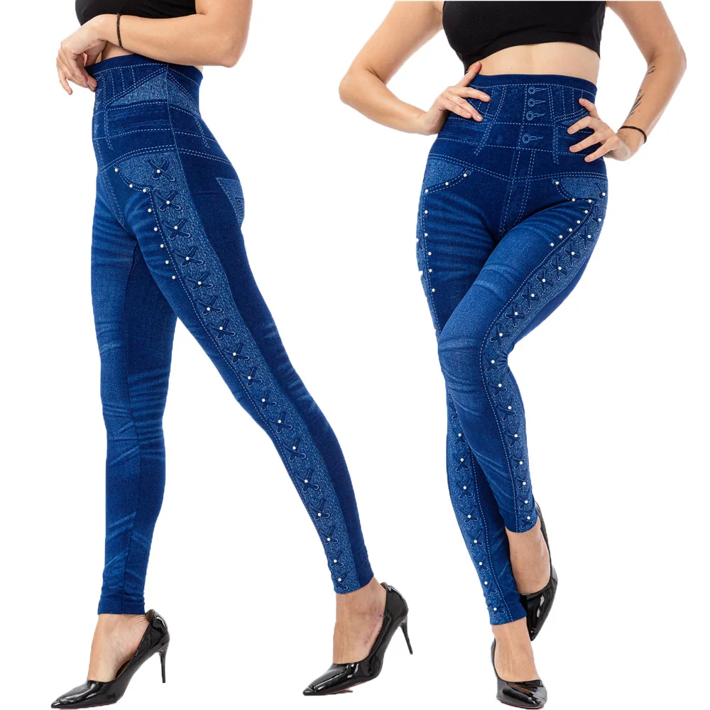 Женские спортивные Леггинсы с высокой талией, имитация бисера, джин...