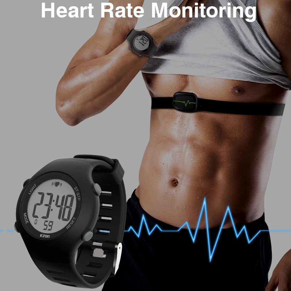 1. Секундомер2. Хронограф3. Календарь на 50 лет4. Монитор сердечного ритма5. 5,3 кГц трансмиссия6. Сигнал о зоне сердечного ритма в верхней и нижней частях7. Диапазон пульса: 40-2208. Сигнализация9. Ежечасный сигнал10. Водонепроницаемость 50 метров11. Подсветка ELПараметры1. Бренд: Ezon2. Номер товара: T0073. Дисплей: цифровая/точечная матрица4. Точность: +/-1 секунды в день5. Источник питания: аккумулятор CR2032 (в комплекте)-1 шт.6. Срок службы батареи: около 12 месяцев7. Диаметр циферблата: 47 мм8. Чехол Толщина: 13 мм9. Размер ремешка: 22 мм x 240 мм10. Водонепроницаемость: 50 метров