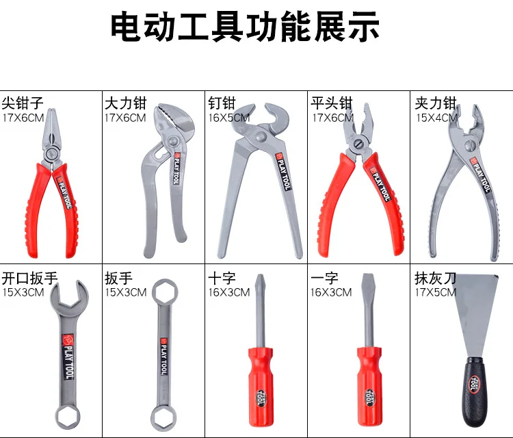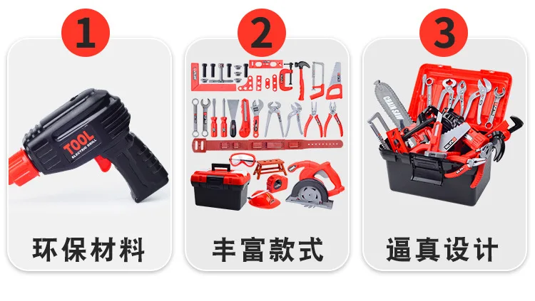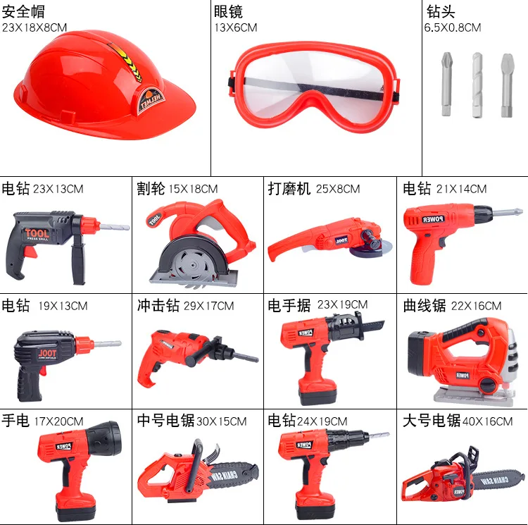 Детский набор инструментов для ремонтаХарактеристики: Безопасный инструмент для моделирования: молоток, отвертка, гаечный ключ, шлем и т. Д.Материал игрушки: Изготовлен из экологически чистого материала, не наносит вреда вашим детям.Электрическая дрель: 2 * батарейки типа АА (не входят в комплект)Развитие способностей: обучение хвату и заинтересованности; Практика и мышление, интеллектуальное развитие; Визуальное, сенсорное, слуховое и другое обучение способностям; Координацию рук и глаз, общение родителей и детей, интерактивные игрушки
