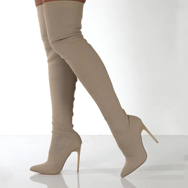 Женские сапоги выше колена с острым носком, на тонком каблуке, без ...