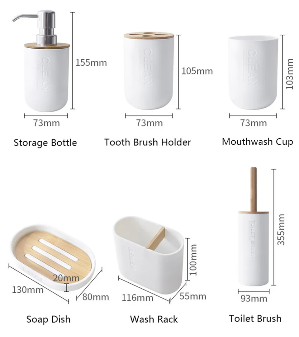 Обратите внимание: в комплект поставки не входят деревянные поддоны из телячьей шерсти!ОсобенностиИзготовлен из полипропиленового материала, экологически чистый и здоровый.Украшенный бамбуком и деревом, натуральный, элегантный и со вкусом.Чашка для полоскания рта:Современный дизайн, хороший процесс, гладкая поверхность. Держатель туалетной щетки:Щетка с бамбуковой ручкой и ПП держатель основания.Герметичный дизайн, запах не подвержен воздействию.Мыльница:Бамбуковые деревянные поддоны могут быть вывезены.Полый дизайн с функцией слива. Мыло для рук шампунь бутылка для хранения жидкости:Гладкие и гладкие насадки подходят для вашей ладони. Держатель зубной пасты:Встроенная бамбуковая перегородка для разделения зубной пасты и зубной щетки.Бамбуковая перегородка может быть вывезена. Держатель зубной щетки:Четырехкомпонентный дизайн для зубных щеток до 4.Бамбуковая перегородка может быть вынута, затем держатель зубной щетки может использоваться в качестве чашки.ПосылкаКомплект из пяти предметов включает:1x мыльница1x стойка для мытья1x держатель для зубной щетки1 чашка для полоскания рта1 бутылка для хранения жидкого мыла для рук