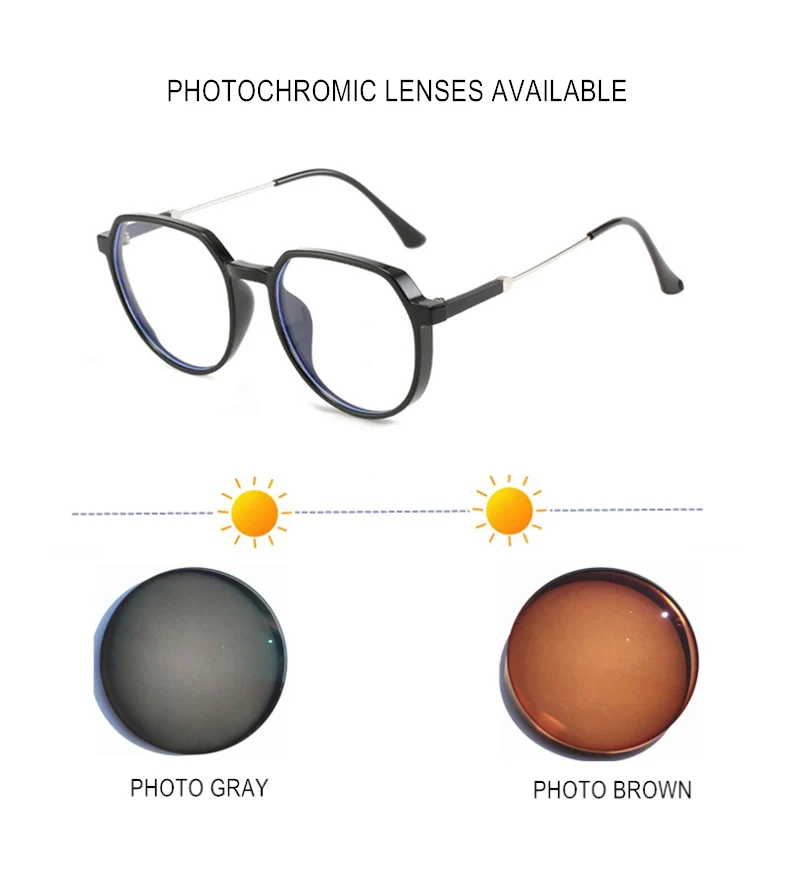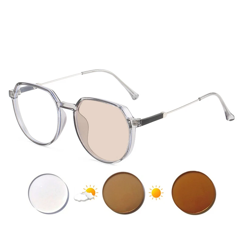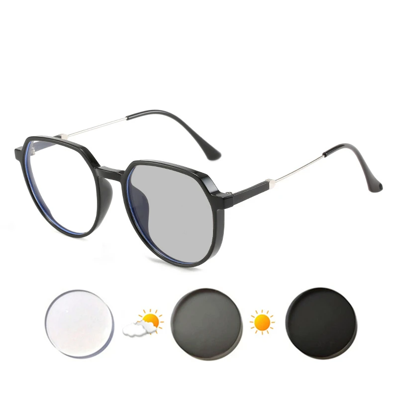 О фотохромные линзы, они будут прозрачными и бесцветными в помещении или в темных местах, но они изменят цвет на открытом воздухе или на солнце, чтобы защитить ваши глаза от сильного светильник.