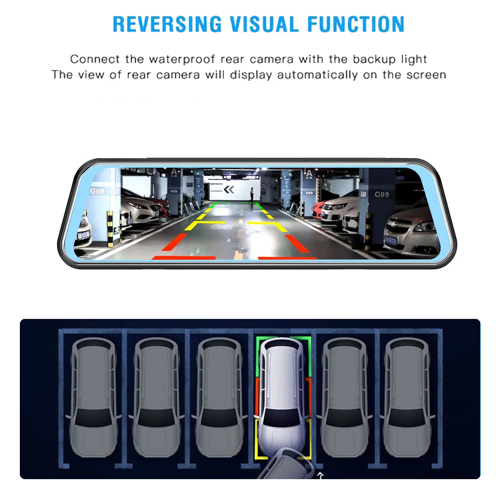 Этот автомобильный видеорегистратор имеет две камеры, которые позволяют одновременно записывать видео с двух разных углов. Изображение на изображении позволит вам иметь четкое представление с фронтальной и задней камеры. Когда автомобиль входит в механизм обратного хода, этот Автомобильный видеорегистратор автоматически переключается на изображение камеры заднего вида с помощью линии парковки.