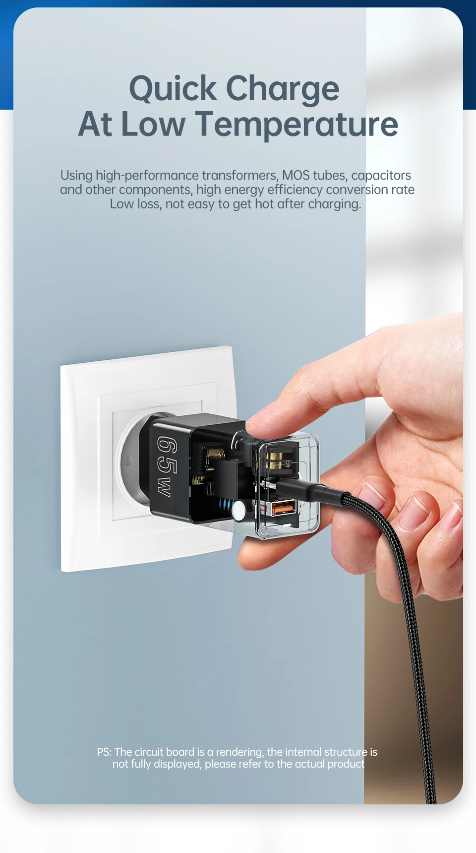 Быстрая зарядка высокой мощности 65 Вт● Высокая мощность 65 Вт● Защита безопасности● Протокол быстрой зарядки интеллектуального распознавания● Меньший размер