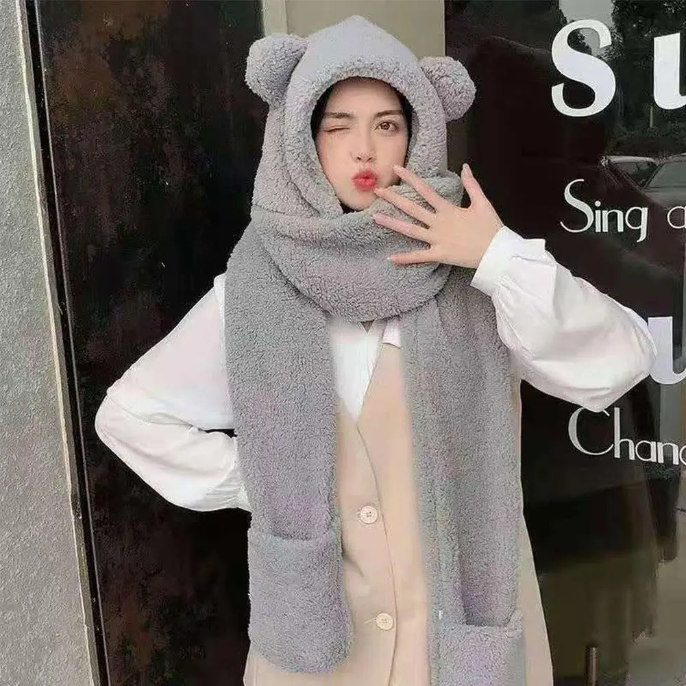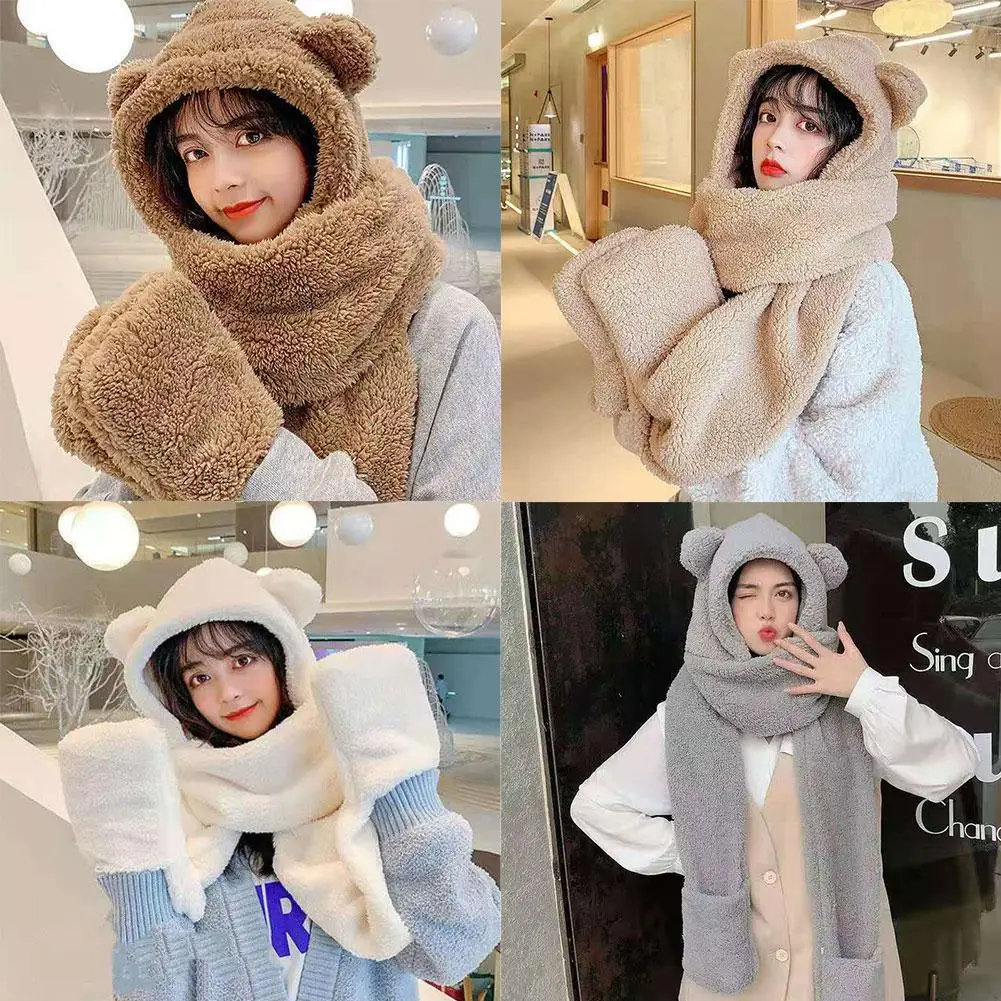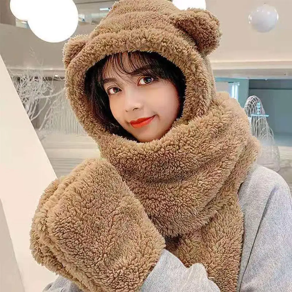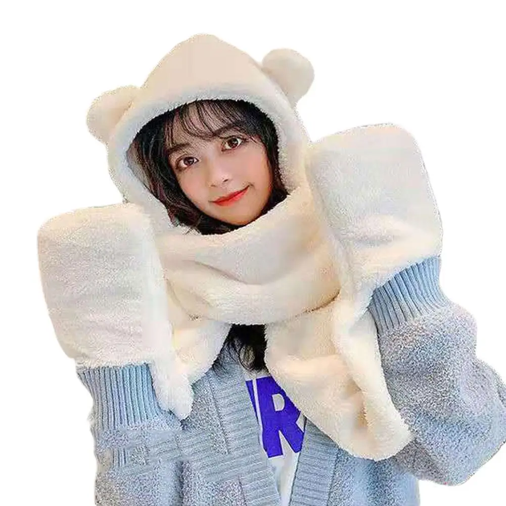 Комплект из шапки, шарфа и перчаток с милым медведем, повседневные флисовые зимние женские крышки для девочек-новинки, Теплые повседневные плюшевые шапки, милые аксессуары