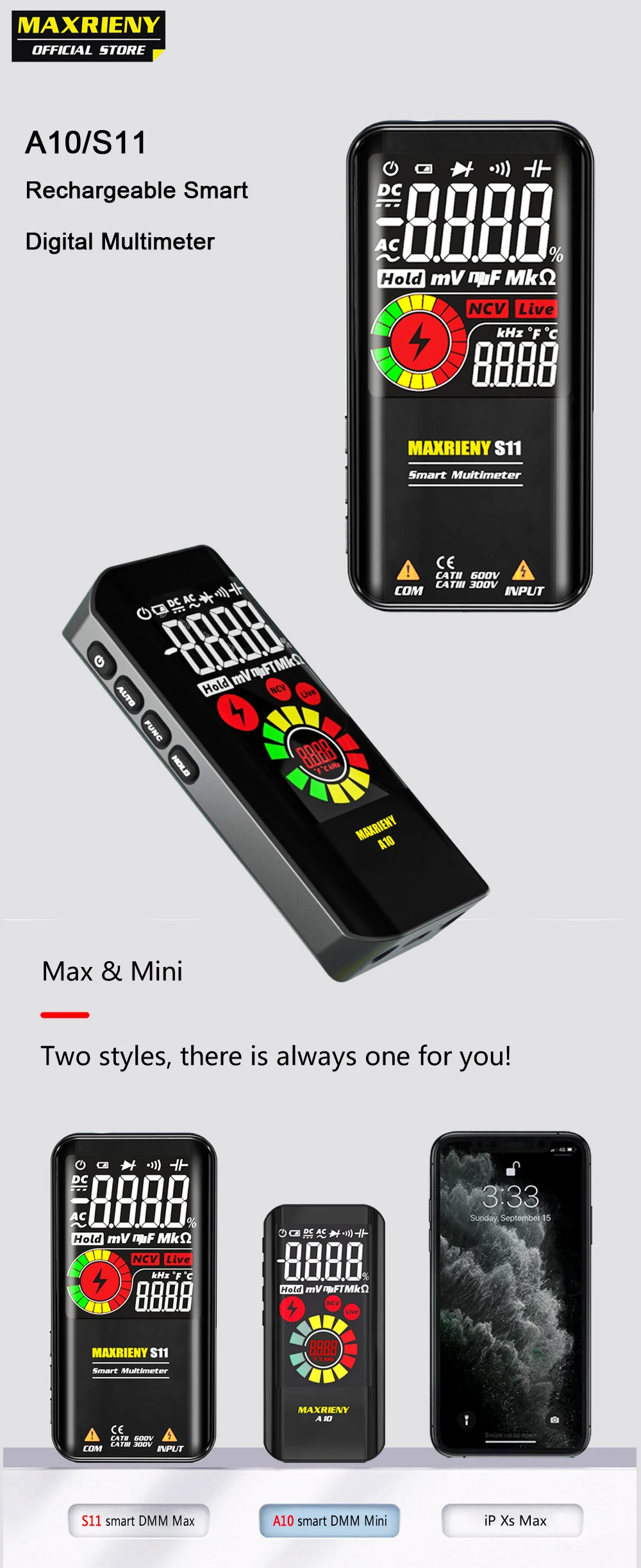 Цифровой мультиметр MAXRIENY S10 S11 A10 S20 умный конденсатор переменного напряжения постоянного тока Ohm диод NCV Hz Тестер DMM с перезаряжаемой батареей-
