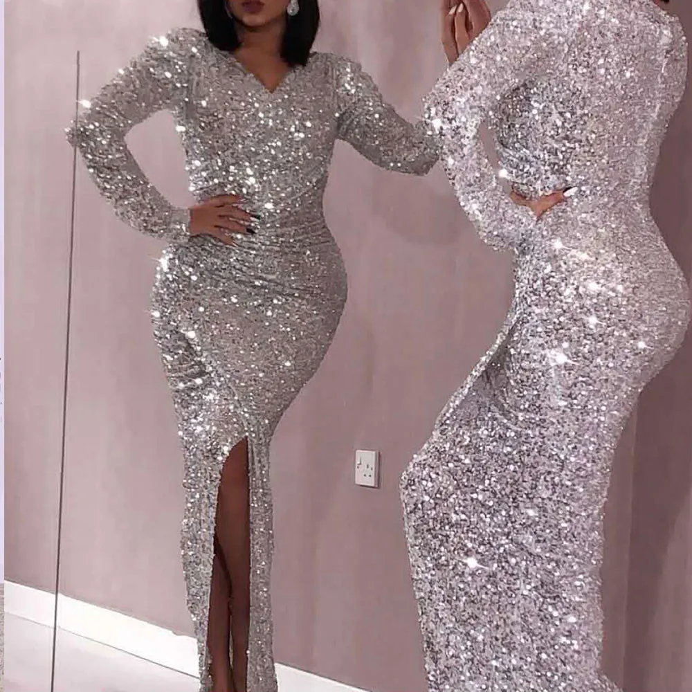 Женское бархатное платье с блестками, вечернее платье с юбкой годе, V-образным вырезом и длинным рукавом, сексуальное платье для выпускного вечера, 2022