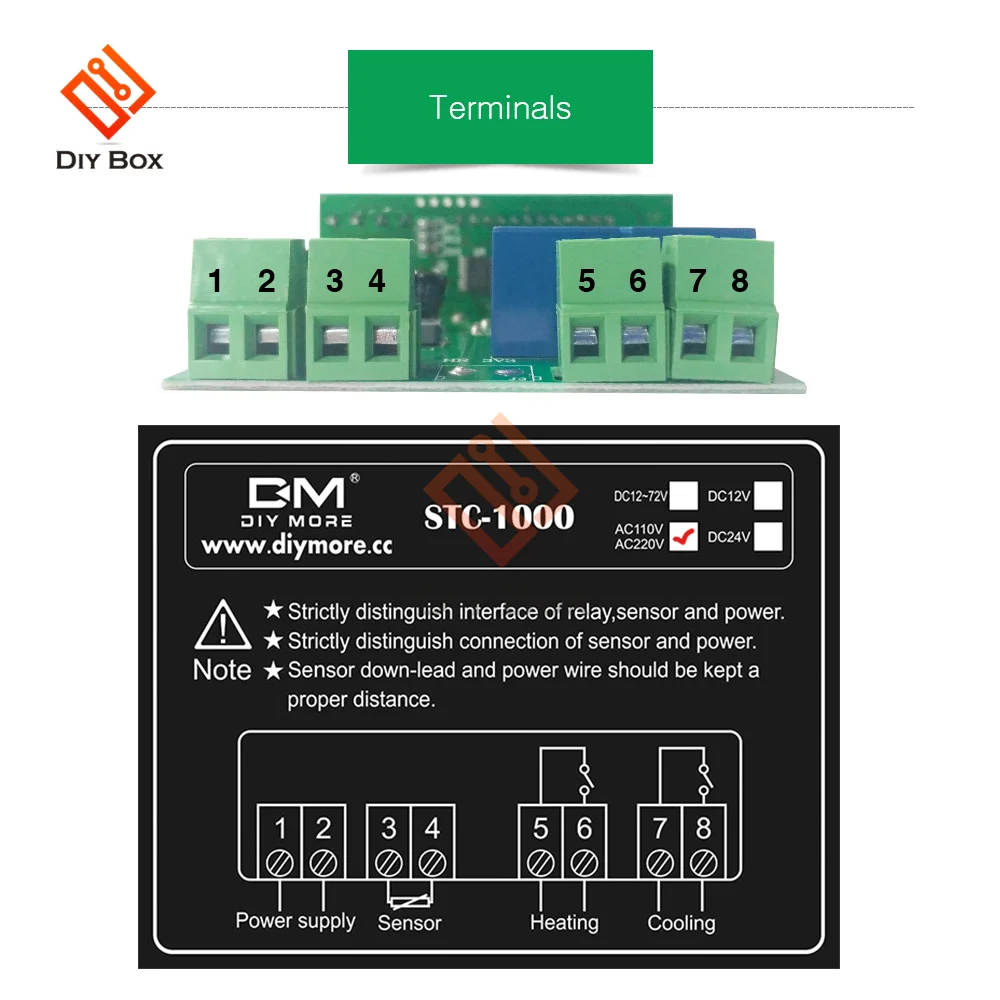 Основные параметры:Название продукта: цифровой контроллер температуры микрокомпьютераНазвание продукта: STC-1000Диапазон измерения: -50 ℃ ~ 99 ℃Точность измерения: ± 1 ℃ (-50 ℃ ~ 70 ℃)Разрешение: 0,1 ℃Энергопотребление всего станка: менее 3 ВтДатчик: Датчик NTC (1 метр)Температура окружающей среды: 0-60 ℃Относительная влажность: 20-85% (без конденсации)Открытие установки: 71*29 ммМатериал корпуса: АБС огнестойкий пластиковый корпусВыходная мощность: охлаждение (10A/250VAC) Нагревание (10A/250VAC) Посылка включает в себя:1 * термостат