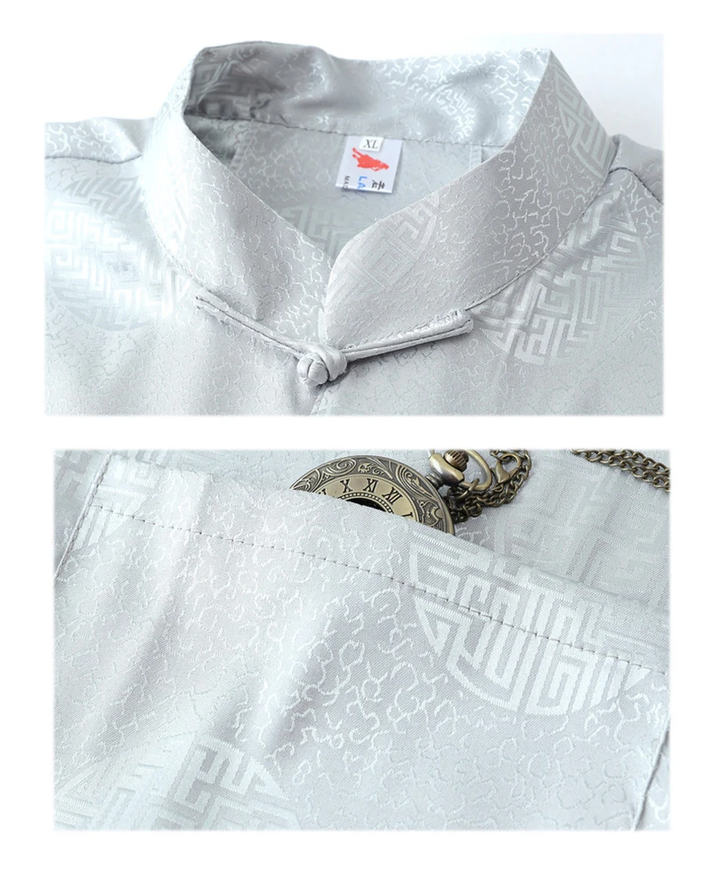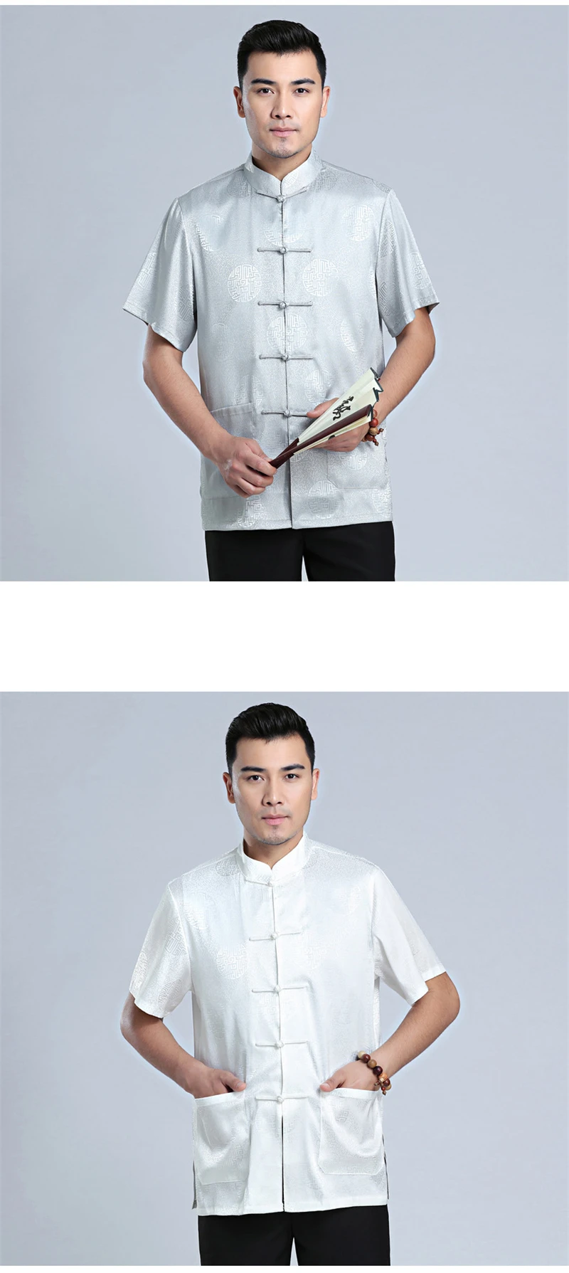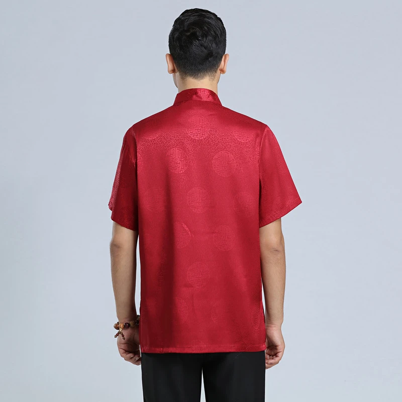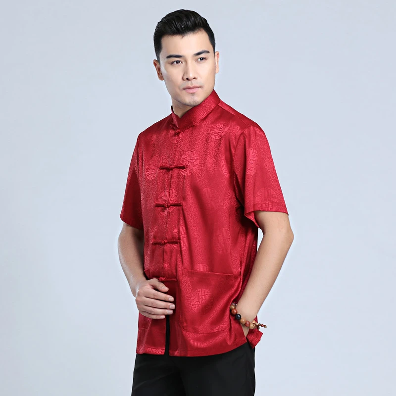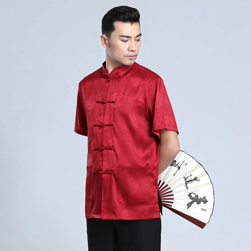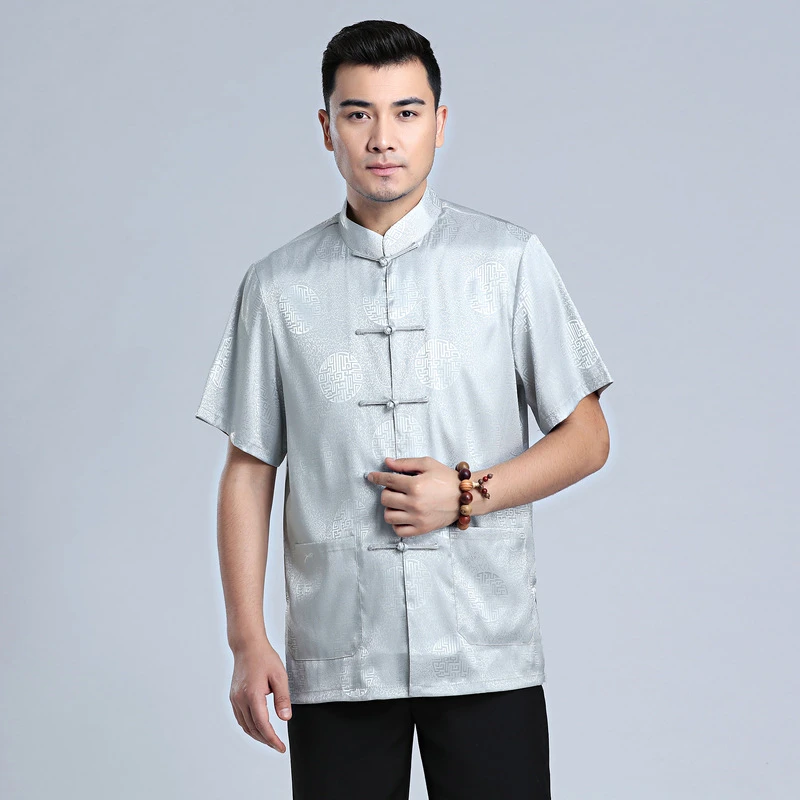 Китайские традиционные костюмы Tang костюм для мужчин, атласная красная рубашка, топы кунг-фу, серая, Белая Летняя Восточная одежда с коротким рукавом