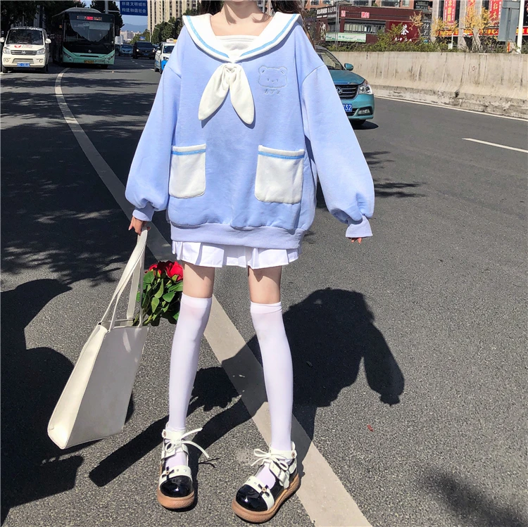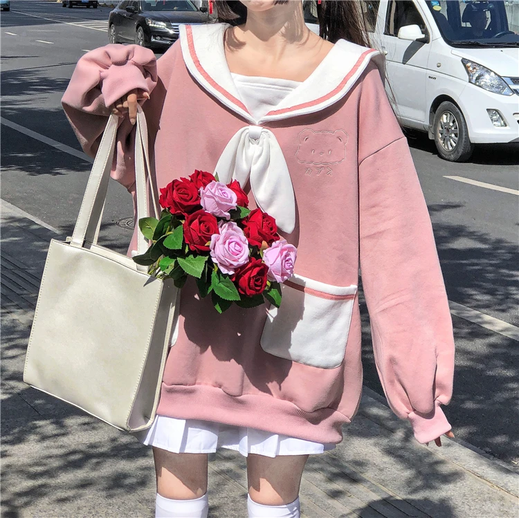 Японский преппи стиль JK Студенческая Женская Повседневная Толстовка бант матросский воротник вышивка медведь кавайные толстовки одежда для лучшей подруги