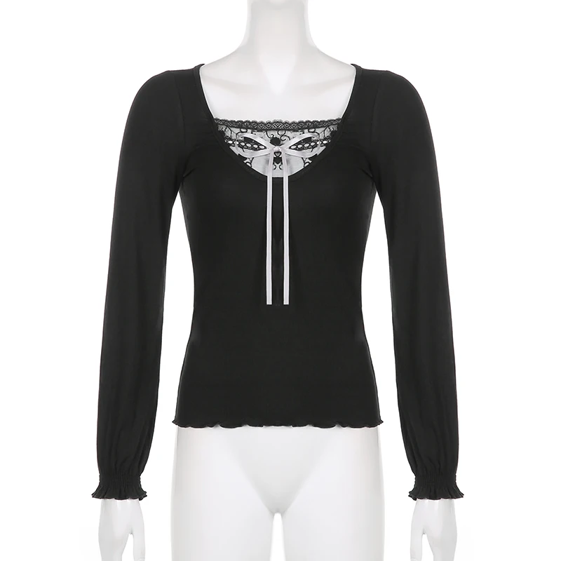 Y2k Fairycore Grunge милый топ винтажная Черная Кружевная футболка ...