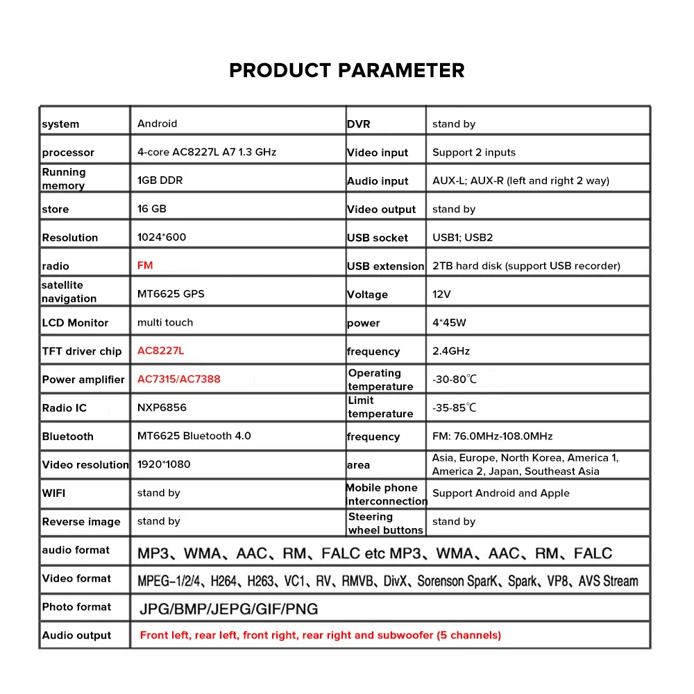Основной чип Android: четырехъядерный 8227L Оперативная память: 1G Хранение: 16 г Версия: Android 10,0 Рабочее напряжение: 12 В постоянного тока Рабочая температура: -20 ~ 70 ℃ Размер экрана: 9 дюймов Разрешение: 1024*600 Сенсорный экран: 2.5D закаленный сенсорный экран Радио: Радио чип 8227L FM 87,5 MHz-108 MHz RDS Радиочастота: Европейская частота (по умолчанию) Видеовыход: Поддержка Аудиовыход: Поддержка Реверсивный вход: поддержка Обнаружение заднего хода: Поддержка контроля заднего хода Функция напоминания о тормозе: Да Пароль подключения Bluetooth: 1234 Версия Bluetooth: 4,0 Настройка логотипа автомобиля: Поддержка Функция управления рулем: Да Чип усилителя мощности: 7388 Кнопка сброса: Нажмите кнопку сброса с небольшим острым предметом Время система: 24-х часовой системы/12-часовом формате система по желанию Оригинальный Автомобильный руль управления: поддержка подключения к оригинальному автомобильному рулевому колесу (после установки) Передний вспомогательный Аудио вход: Встроенный микрофон Поддержка Регулятор громкости: Полный сенсорный экран Поддержка функции напоминания видео (пожалуйста, не смотрите видео во время вождения) в соответствии с законодательством и правилами ЕС Поддерживаемые форматы изображений: JPEG, GIF, PNG, BMP, JPG Поддерживаемые форматы видео: MP4 / MP5 / MKV / AVI /RMVB /1080P Поддерживаемые Аудиоформаты: MP3 / WMA / WAV / FLAC Вывод терминала: 2 канала аудиовхода, 1 канал AV видео входа, 1 канал заднего входа, 1 канал видеовыхода, 2 канала аудиовыхода, 1 канал сабвуфера, Языки: традиционный китайский, упрощенный китайский, японский, немецкий, английский, испанский, французский, итальянский, голландский, польский, Португальский, вьетнамский, русский, турецкий, тайский, персидский, Багамский, чешский, датский, венгерский, румынский, финский, шведский, уйгурский, греческий, персидский Характеристика: 2 вида шнура питания + протокол, высокое соответствие и установка без потерь Беспроводной WIFI: Поддержка 3G 4G 5G приема беспроводного сигнала, сигнал плавный Радио: Поддержка FM/RDS Bluetooth телефон: Поддержка ответа/совершения звонков, поддержка чтения телефонной книги на мобильный телефон. Bluetooth Музыка: поддержка Bluetooth беспроводного воспроизведения музыки. Мобильный телефон: зеркальное соединение, Поддержка односторонней работы устройств iOS и двусторонняя работа телефонов Android Gps-навигация: поддержка онлайн/автономной навигации Изображение заднего хода: Поддержка видео входа заднего вида высокой четкости Музыкальный проигрыватель: мультимедийный u-диск (воспроизведение звука) Воспроизведение видео: поддержка видео высокой четкости 1080P Функция USB: Поддержка двух usb-каналов (воспроизведение мультимедиа, передача файлов, подключение устройства DVR) Функция AUX: можно подключить на мобильный телефон аудио или MP3 аудио вход, внешнее устройство видео вход Выход сабвуфера: Поддержка всех видов сабвуфера Сплит-экран: Поддержка левого и правого сплит-экрана Функция «картинка в картинке»: Поддержка воспроизведения видео на картинке (просмотр видео во время навигации) Управление рулем: поддержка установки руля Многоточечное касание: емкостный сенсорный экран высокой четкости Защита от нескольких замыканий (перегрузка, перенапряжение, короткое замыкание) Несколько эквалайзеров выбор звуковых эффектов Функция отключения памяти Упаковочный лист Содержит: 1 хост 2x шнур питания 2x USB 1x реверсивная 