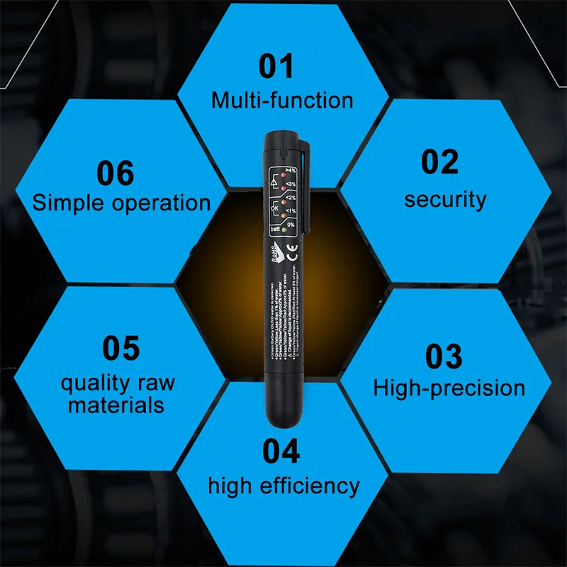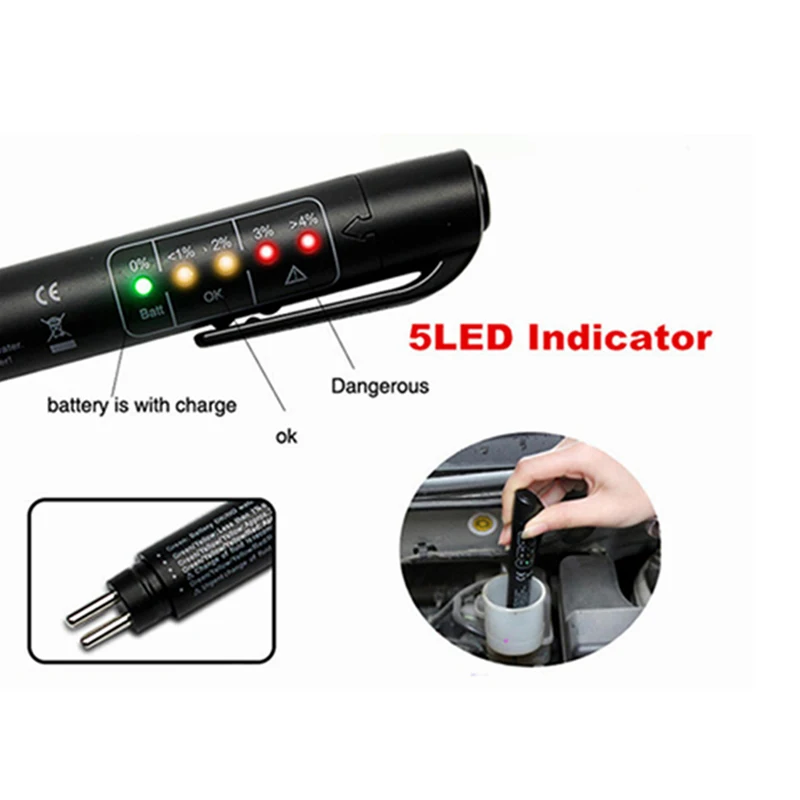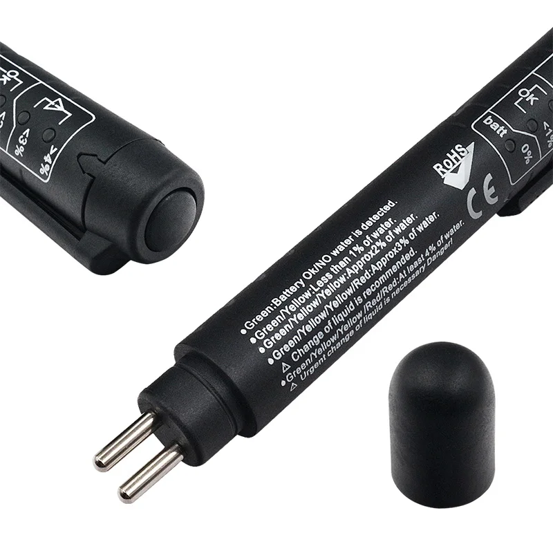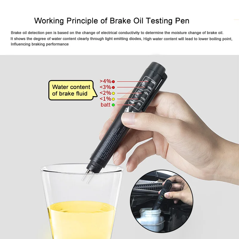Ручка обнаружения тормозной жидкости основана на изменении проводимости для определения влажности тормозной жидкости. Он четко показывает степень влажности, содержащую светильник-излучающий диод, высокое содержание влаги приведет к более низкой температуре кипения, влияет на эффективность торможения. Красный цвет означает, что Тормозная жидкость нуждается в немедленном замене, зеленый цвет представляет хорошее состояние, желтый цвет означает, что состояние приемлемо, но вскоре заменяется.
