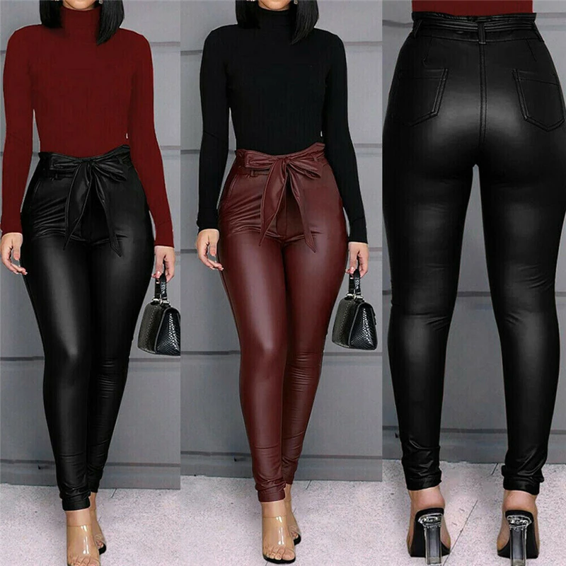 Женские новые модные тонкие леггинсы из искусственной кожи с бантом эластичные повседневные узкие брюки эластичные сексуальные леггинсы осенние брюки