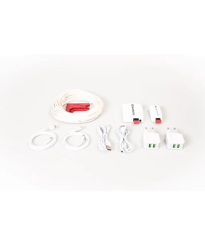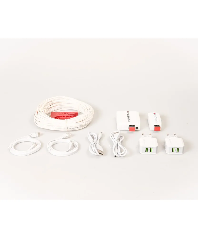Комплект состоит из 1 ACT1003 и 1 ACT1001 с их соответствующими источникамиИсточник питания, 20 метров волокна POF, 1 резак и 2 кабеля ethernet.