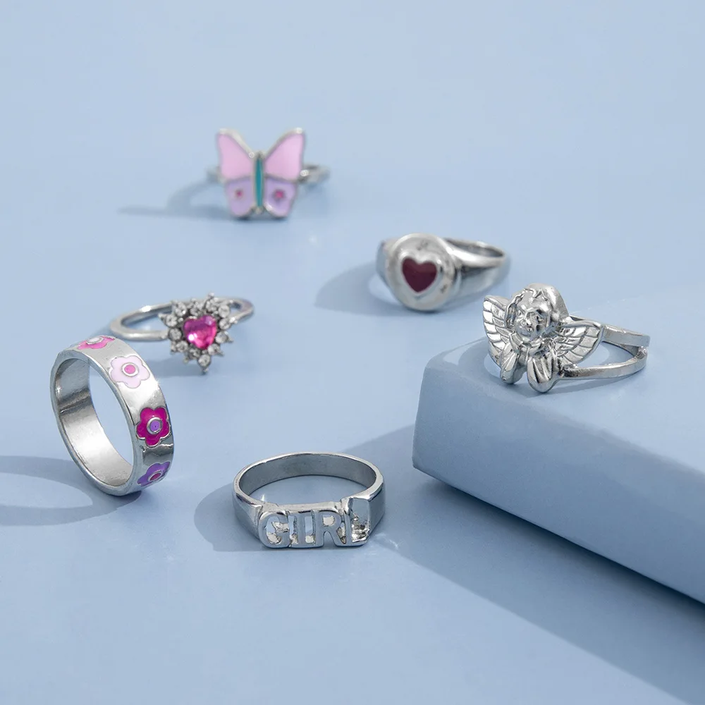 Новинка, 6 шт., милые розовые кольца с бабочками, набор для женщин, модное сердце, кристалл, ангел, буквы, Совместное кольцо, женские вечерние ювелирные изделия, подарок