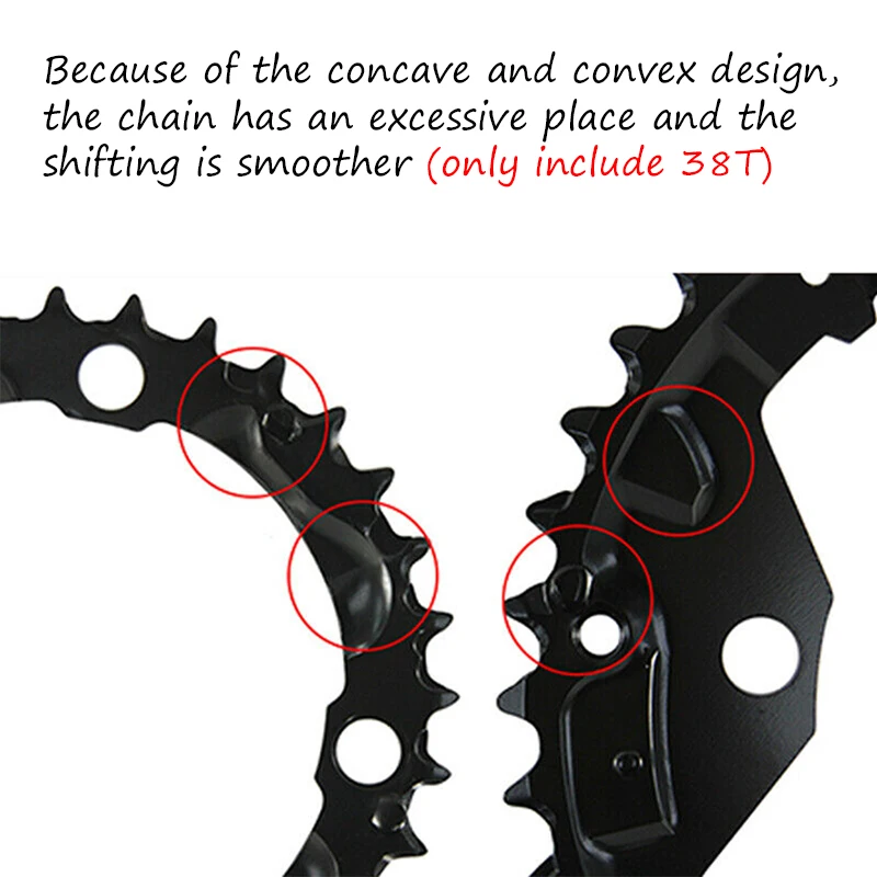 Особенность (только включает 38T): специальный дизайн профилей зубов приводит к цепочке, что делает кольцо более легким, когда происходит переменная скорость. Во-вторых, из-за вогнутой и выпуклой конструкции цепь имеет чрезмерное место, поэтому скорость езды может быть более гладкой.
