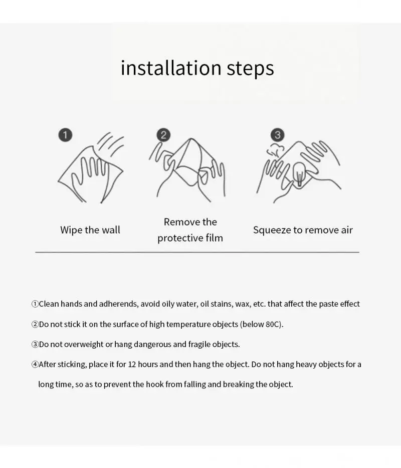 Установка без перфорации. Крючок поставляется с сильным клеем, просто оторвите защитную пленку и вставьте ее. Шаги установки просты и легко снимаются, не оставляя следов.