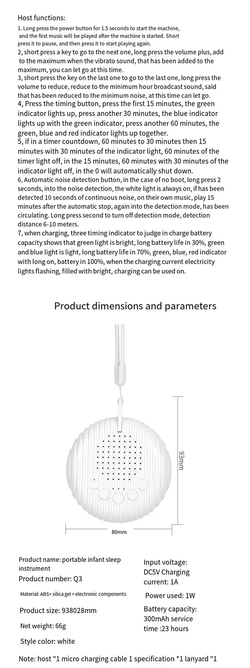 1. 10 гладких и естественных звуков: белый шум, волны океана, звуки птиц, звуки сердцебиения, звуки часов, крикет, звуки беговой воды и 3 колыбельные. Это помогает блокировать отвлекающие факторы и создавать идеальную среду для сна, расслабления или концентрации. Очень легко выбрать нужные звуки.2. Таймер автоматического отключения: этот белый шумов может работать непрерывно без перерыва, или есть автоматический таймер отключения от 15 мин, 30 мин или 60 минут (зеленый синий красный светильник) чтобы не забыть выключить, когда вы засыпаете, экономя энергию.3. Автоматическое обнаружение белого шума: без включения питания, нажмите и удерживайте авто в течение 2 секунд, чтобы ввести Обнаружение шума в течение 10 с. Если шум вокруг, он автоматически включит музыку и остановится через 15 минут. Обнаружение будет циклическим. Расстояние обнаружения 6-10 м.4. Не только для сна: Наша белая звуковая машина может не только скрыть шум, улучшить качество сна и расслабиться. Подходит для использования дома, офиса, общежития, детского сада или в любом месте, где вы хотите быть уверены.5. Небольшой и Портативный: только в том случае, 9,3*8*2,8 см, занимает мало места на тумбочку, он может быть легко положить в сумку или чемодан, что делает его идеальным спутником для путешествий. Usb-зарядка, зарядка один раз, самая длинная может использоваться непрерывно в течение 36 ч, которая используется для длительного времени. Мини-звуковая машина для сна-это идеальный белый шум для путешествий. Он легко помещается в сумку или чемодан, чтобы создать знакомую спящую среду для вашего ребенка независимо от того, куда вы путешествуете.Характеристики:Цвет: белыйМатериал: АБС-пластик и силиконВходное напряжение: DC5V = 0.5AМощность: 1 ВтЕмкость аккумулятора: 300 мАчВремя использования: 23 часа (измерено около 36 ч)Время зарядки: 1 часСертификация: CE, FCC, ROSHВес изделия: около 66 гВес посылка: около 125 гПосылка включает:Упаковочный лист:1 * хост1 * USB кабель1 * руководство на английском языке1 * ремешок1 * цветная коробка