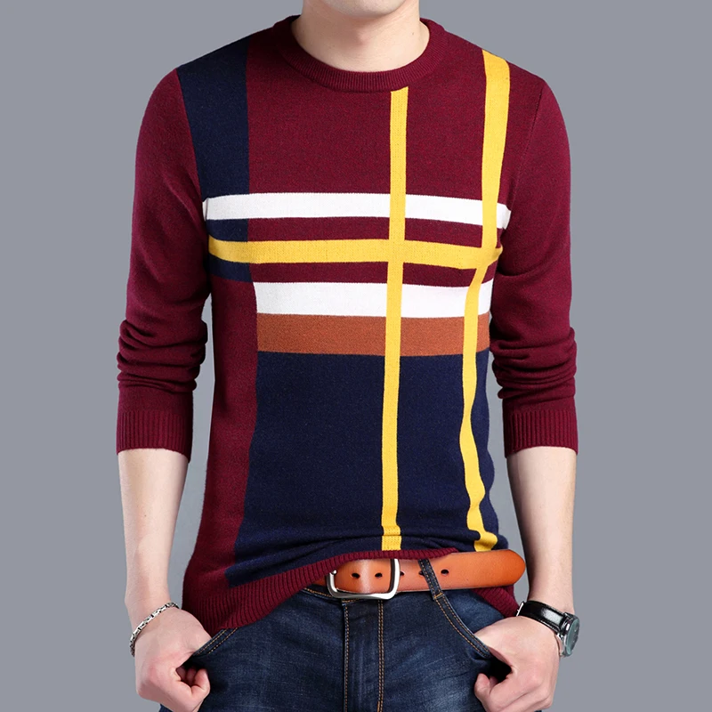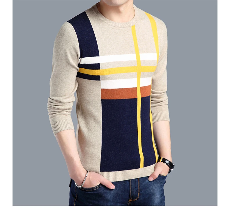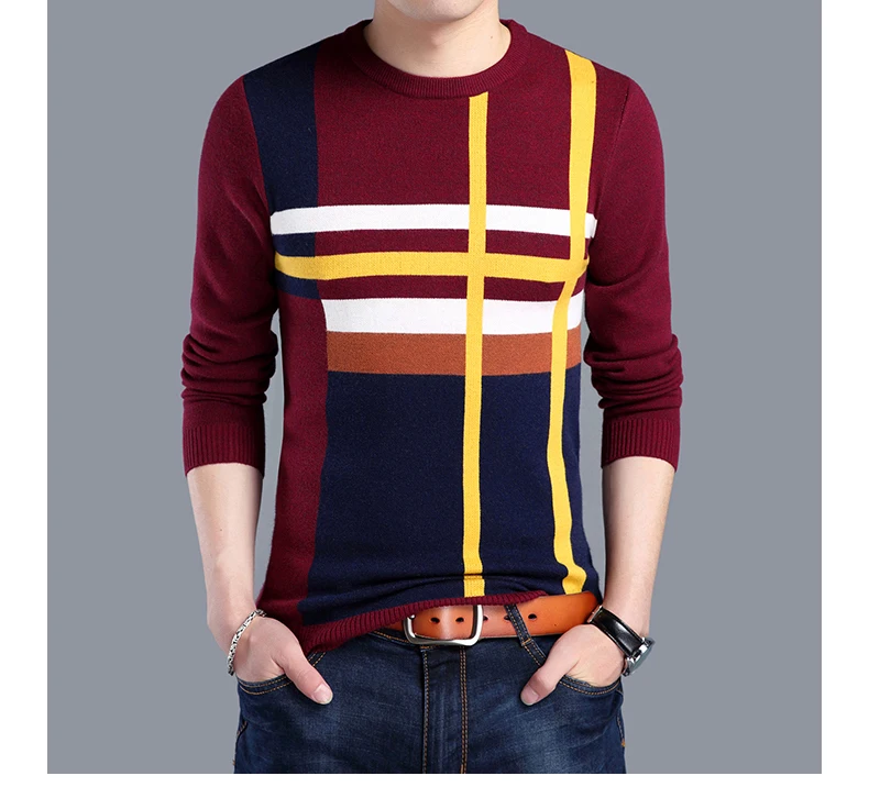 Мужской шерстяной свитер в клетку, трикотажный облегающий джемпер с круглым вырезом, повседневная одежда в Корейском стиле, Y444
