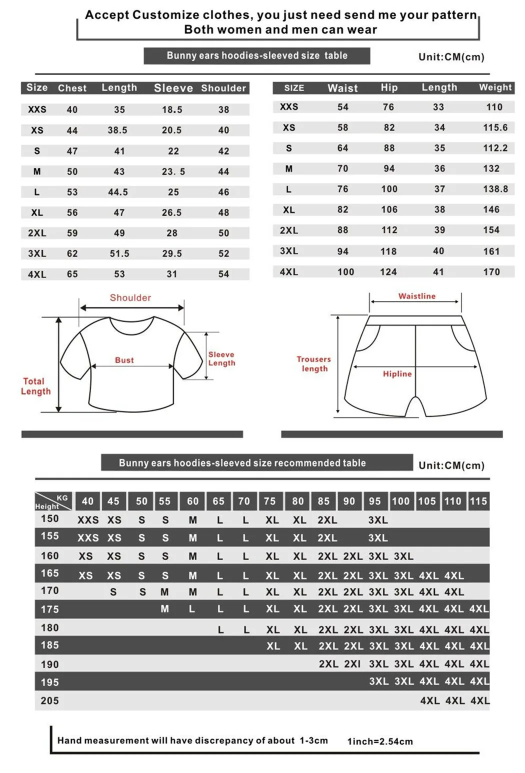 1. Ошибка в размере: Таблица размеров для ручного измерения, пожалуйста, учитывайте погрешность в 1-3 см (1 см = 0,3917 дюйма)