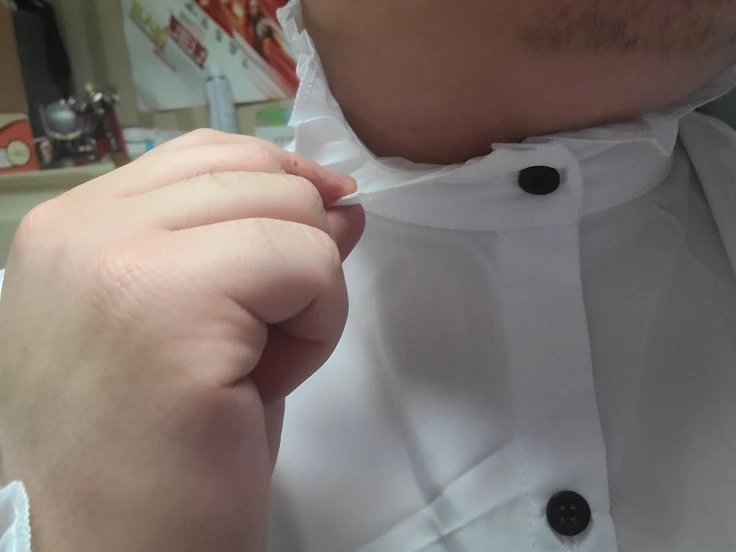Белый, черный и розовый цвета оборками со стоячим воротником и рука...