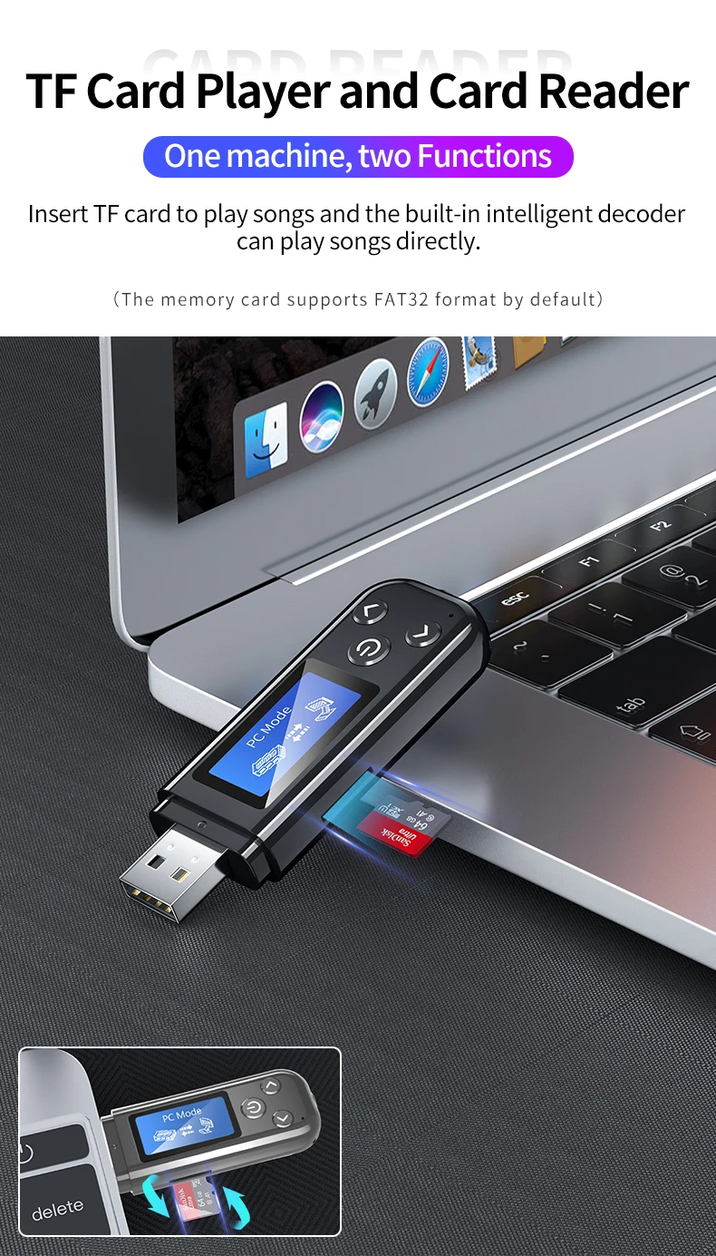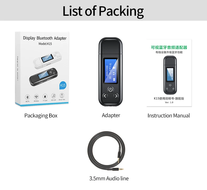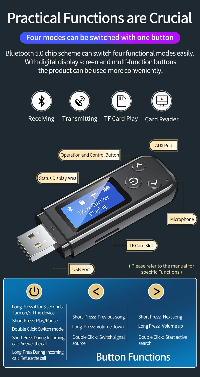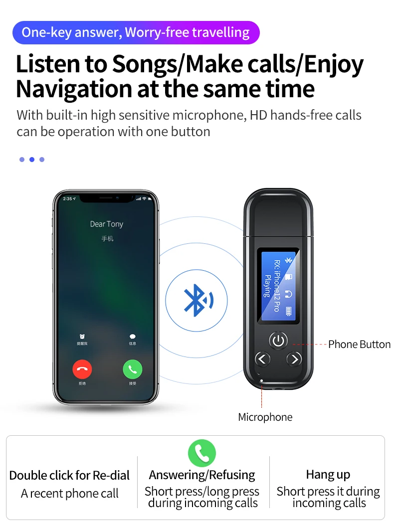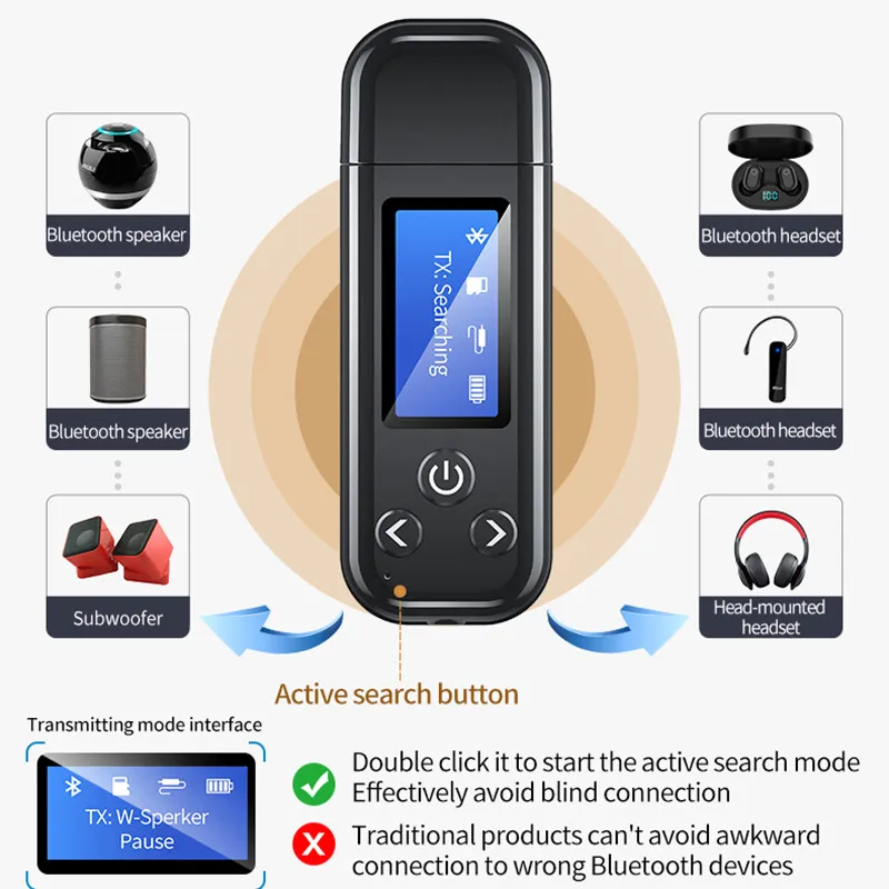 ① Оснащен чипом Bluetooth 5,0, стабильной передачей без задержек и качеством звука без потерь;②Bluetooth прием и передача двух в одном, без драйвера, подключи и работай;③ ЖК-дисплей высокой четкости, режим Bluetooth и рабочий статус четко видны;④Режим запуска может отображать имя сопряжения, активно искать и отказываться подключаться слепо (эта функция является первой);⑤ Встроенный полимерный аккумулятор 170мА, непрерывное прослушивание песен около 4 ч, Прямая зарядка/источник питания от USB;Support поддержка воспроизведения tf-карт, а также считыватель карт и внешняя звуковая карта компьютера;Built Встроенный микрофон высокой четкости, поддержка громкой связи/прослушивания музыки/навигации;⑧Функция памяти, автоматическое повторное подключение после первого сопряжения;Stable стабильная передача сигналов без препятствий около 10 метров;