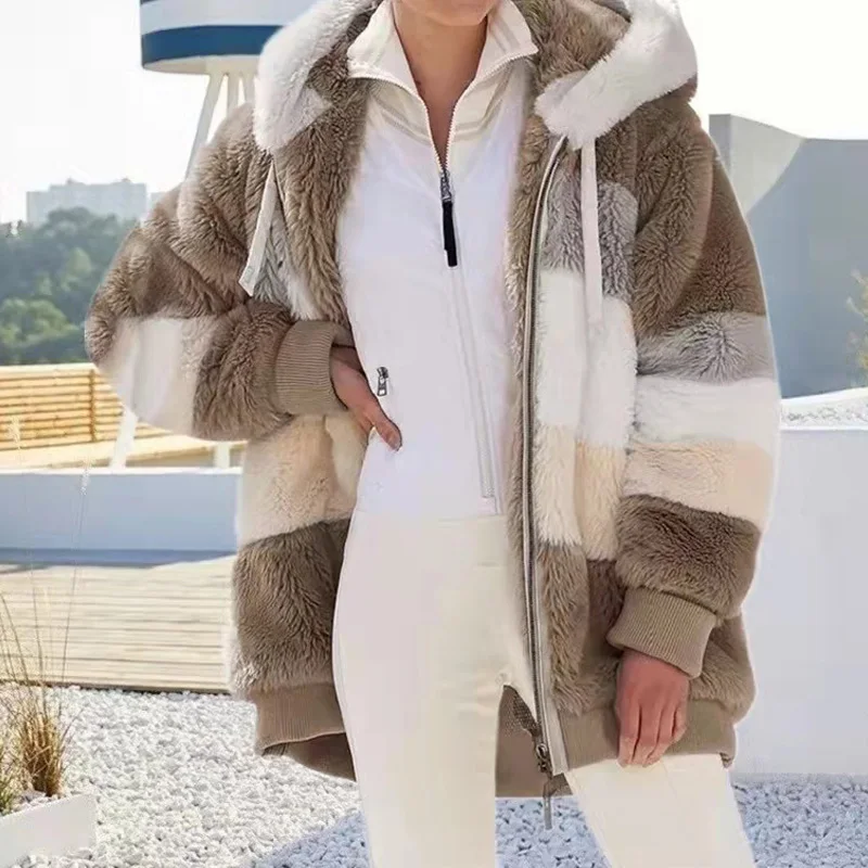 Женская теплая куртка на молнии, Повседневная Свободная мягкая куртка из искусственного меха с разноцветным пэчворком, плюшевая верхняя одежда на осень-зиму