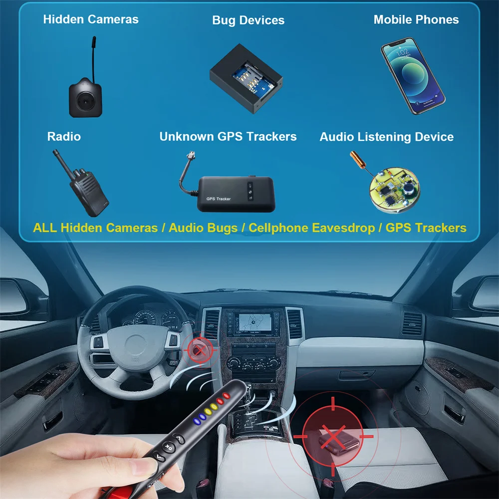 Как использовать?RF Detection: переместите несколько функциональных переключателей в положение радиочастотного обнаружения, нажмите кнопку «next» и «previous» для регулировки чувствительности, установите чувствительность на уровень 4, удерживайте детектор в подозрительной области, если светодиодный светильник детектора мигает звуковым сигналом, Это означает, что рядом с подозрительным объектом, если светодиодный светильник детектора не мигает, вы можете увеличить чувствительность до уровня 5 или уменьшить чувствительность, если всегда будильник, пожалуйста, не включайте шестое светодиодный светильник, он достигнет максимальной чувствительности, устройство всегда будет оповещать.Сигнализация движения двери и багажа: переместите многофункциональное переключение в положение будильника, система замолчит в течение 60 секунд, затем перейдите в режим ожидания, когда датчик срабатывает, он будет производить звуковую сигнализацию с красным светильник вспышки.