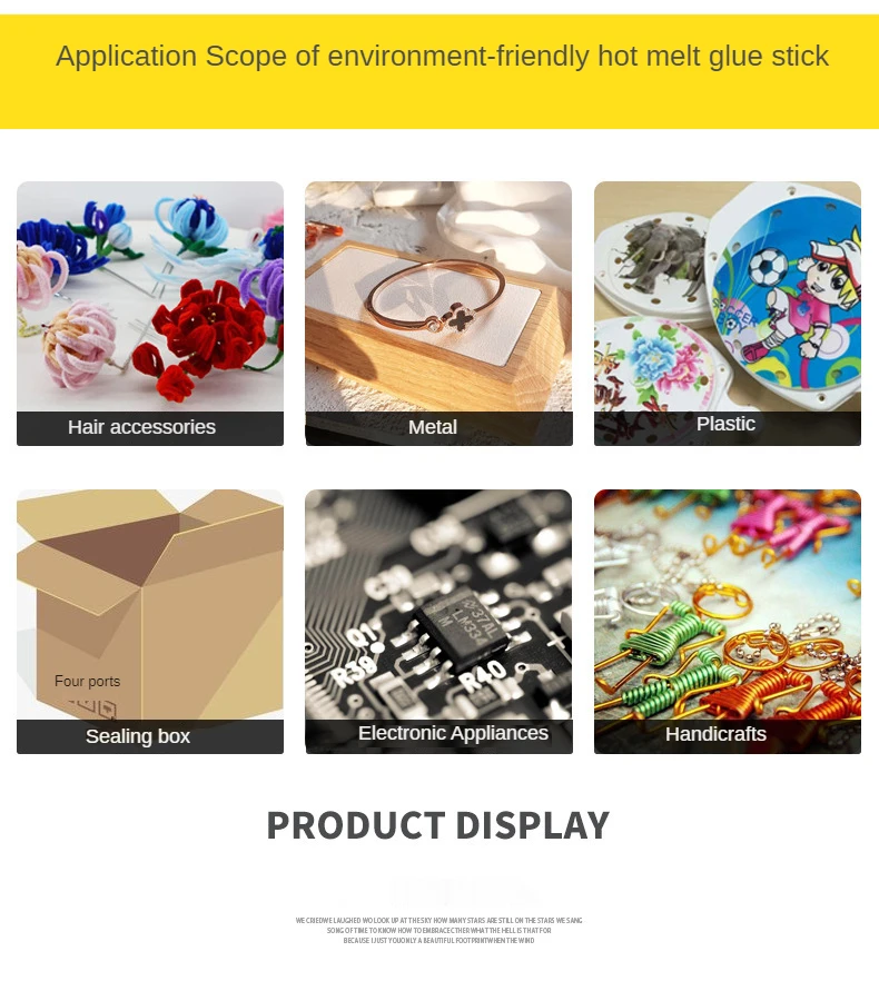 Параметры продуктаНазвание продукта: экологически чистый термоплавкий клейВязкость: 12000-16000 / CPSСтепень размягчения: ≤ 73 °Рабочая температура: 120 ° - 150 °Время отверждения: 10-15sУсловия хранения: нормальное хранение температурыОсновные ингредиенты: основная смола, таксификатор, регулятор вязкости и антиоксидантПрименение: картонная упаковка, ювелирные изделия, изделия ручной работы, игрушки, электронные продукты, пластмассы, ткани, металлические изделия, керамикаМеры предосторожности перед использованием резиновая ручка1. Сначала очистите поверхность объекта, чтобы быть скрепленным, и выберите подходящий термоплавкий клеевой пистолет2. Вставьте клеевую палку с конца клеевого пистолета и отправьте его в ствол пистолета. Подключите источник питания и подогрейте в течение 5-10 минут. Вытяните триггер, чтобы выдавить соль и контролировать выход клея.3. Если вы не можете использовать одну резиновая ручка одновременно, вам не нужно вынимать резиновая ручка. Когда вы используете его в следующий раз, подключите источник питания и подогрейте в течение 5-10 минут.*Сол должен быть предотвращен от прикосновения к коже, чтобы избежать ожогов. Хранить в прохладном, проветриваемом и сухом месте в течение 12 месяцев. Подсказка: пожалуйста, обратитесь в службу поддержки клиентов для полной покупки контейнера.