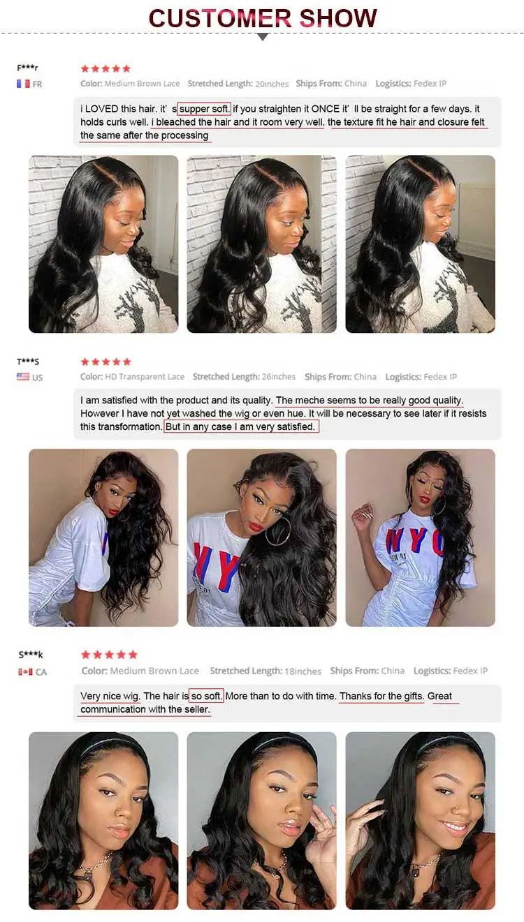 Я очень доволен, красивая текстура очень гладкая! Выглядит так естественно при ношении. Очень точные красивые мягкие волосы! Милое кружево. Я буду возвращенным клиентом, и я буду также обращать внимание на семьи и друзей. К тому же эта компания была так добра ко мне и дала мне так много подсказок, чтобы сохранить эти волосы. Мне понравился их профессионализм, честно говоря, парики Топ, я рекомендую, я буду заказывать у них снова